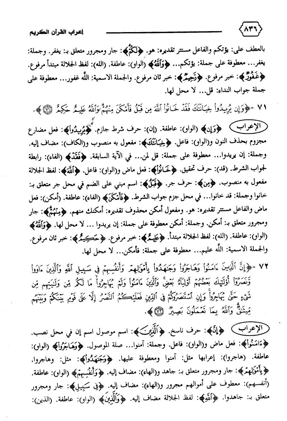 خانوا وجملة: قد خانوا ... في محل جزم جواب الشرط. {فَأَمْكَنَ} (الفاء): عاطفة. (أمكن): فعل ماض والفاعل مستتر تقديره: هو. ومفعول أمكن محذوف تقديره: أمكنك منهم. {مِنْهُمْ}: جار ومجرور متعلق ب: أمكن. وجملة: أمكن معطوفة على جملة: إن يريدوا ... لا محل لها. {وَاللهُ} (الواو): عاطفة. (الله): لفظ الجلالة مبتدأ. {عَلِيمٌ}: خبر مرفوع. {حَكِيمٌ}: خبر ثان مرفوع.