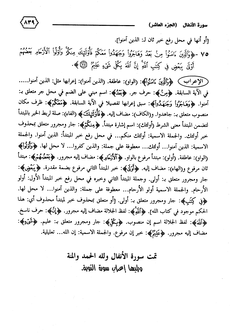 تمت سورة الأنفال ولله الحمد والمنة ويليها إعراب سورة التوبة.