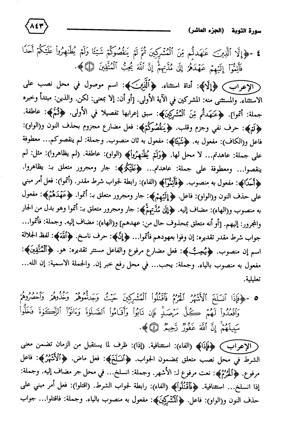 الإعراب {إِلَاّ}: أداة استثناء. {الَّذِينَ}: اسم موصول في محل نصب على الاستثناء. والمستثنى منه: المشركين في الآية الأولى. [أو أن: إلا بمعنى: لكن. والذين: مبتدأ وخبره جملة: أتموا]. {عاهَدْتُمْ مِنَ الْمُشْرِكِينَ}: سبق إعرابها تفصيلا في الأولى. {ثُمَّ}: عاطفة.
