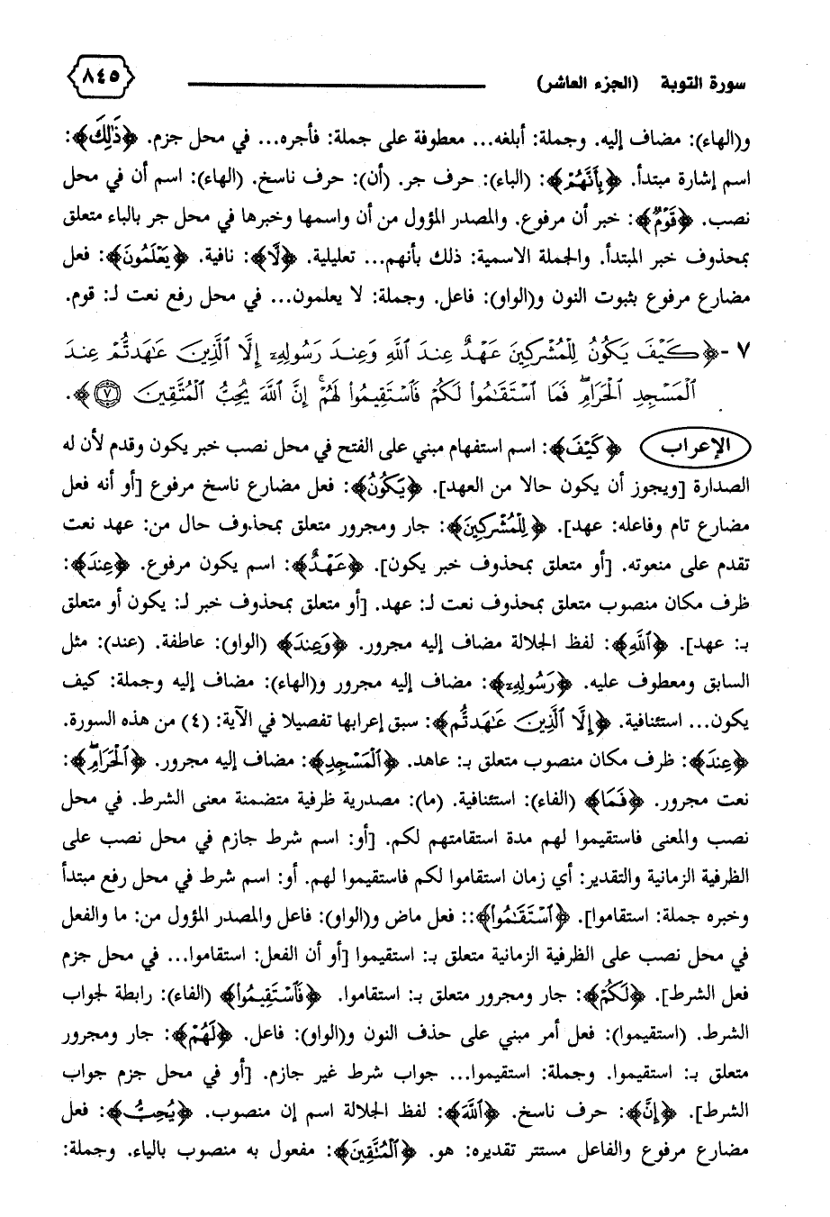 نعت مجرور. {فَمَا} (الفاء): استئنافية. (ما): مصدرية ظرفية متضمنة معنى الشرط. في محل نصب والمعنى فاستقيموا لهم مدة استقامتهم لكم. [أو: اسم شرط جازم في محل نصب على الظرفية الزمانية والتقدير: أي زمان استقاموا لكم فاستقيموا لهم. أو: اسم شرط في محل رفع مبتدأ وخبره جملة: استقاموا]. {اِسْتَقامُوا:}: فعل ماض و (الواو): فاعل والمصدر المؤول من: ما والفعل في محل نصب على الظرفية الزمانية متعلق ب: استقيموا [أو أن الفعل: استقاموا ... في محل جزم فعل الشرط]. {لَكُمْ}: جار ومجرور متعلق ب: استقاموا. {فَاسْتَقِيمُوا} (الفاء): رابطة لجواب الشرط. (استقيموا): فعل أمر مبني على حذف النون و (الواو): فاعل. {لَهُمْ}: جار ومجرور متعلق ب: استقيموا. وجملة: استقيموا ... جواب شرط غير جازم. [أو في محل جزم جواب الشرط]. {إِنَّ}: حرف ناسخ. {اللهِ}: لفظ الجلالة اسم إن منصوب. {يُحِبُّ}: فعل مضارع مرفوع والفاعل مستتر تقديره: هو. {الْمُتَّقِينَ}: مفعول به منصوب بالياء. وجملة: