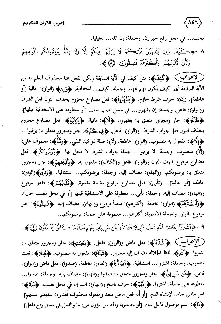 الإعراب {كَيْفَ}: مثل كيف في الآية السابقة ولكن الفعل هنا محذوف للعلم به من الآية السابقة أي: كيف يكون لهم عهد. وجملة: كيف ... استئنافية. {وَإِنْ} (الواو): حالية [أو عاطفة]. (إن): حرف شرط جازم. {يَظْهَرُوا}: فعل مضارع مجزوم بحذف النون فعل الشرط و (الواو): فاعل. وجملة: إن يظهروا ... في محل نصب حال. [أو معطوفة على الاستئنافية قبلها].