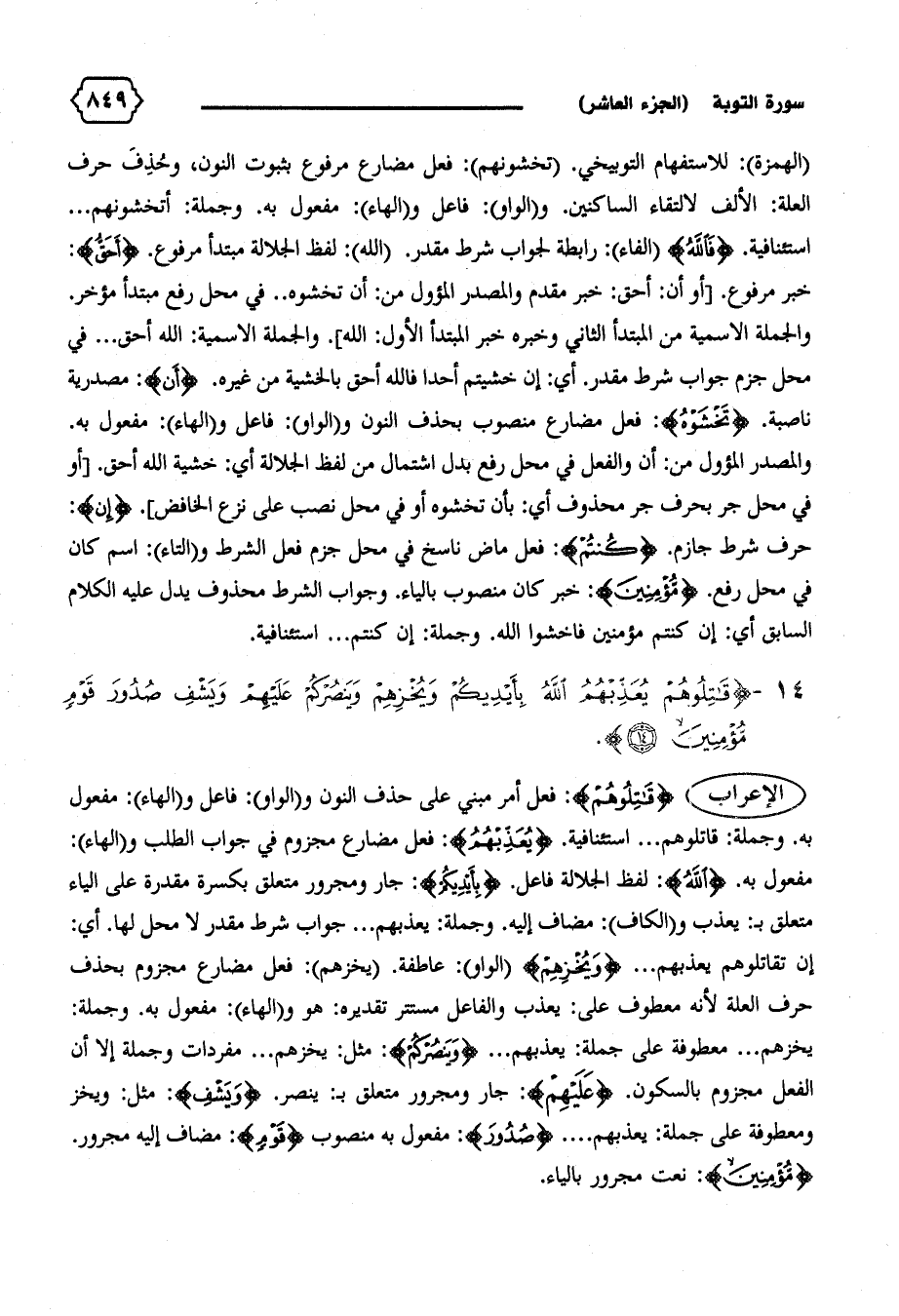 الإعراب {قاتِلُوهُمْ}: فعل أمر مبني على حذف النون و (الواو): فاعل و (الهاء): مفعول به. وجملة: قاتلوهم ... استئنافية. {يُعَذِّبْهُمُ}: فعل مضارع مجزوم في جواب الطلب و (الهاء):