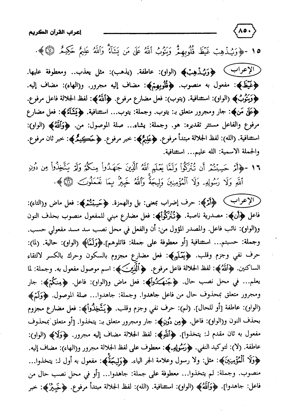 حرف نفي وجزم وقلب. {يَعْلَمِ}: فعل مضارع مجزوم بالسكون وحرك بالكسر لالتقاء الساكنين. {اللهُ}: لفظ الجلالة فاعل مرفوع. {الَّذِينَ}: اسم موصول مفعول به. وجملة: لما يعلم ... في محل نصب حال. {جاهَدُوا}: فعل ماض و (الواو): فاعل. {مِنْكُمْ}: جار ومجرور متعلق بمحذوف حال من فاعل جاهدوا. وجملة: جاهدوا ... صلة الموصول. {وَلَمْ} (الواو): عاطفة [أو للحال]. (لم): حرف نفي وجزم وقلب. {يَتَّخِذُوا}: فعل مضارع مجزوم بحذف النون و (الواو): فاعل. {مِنْ دُونِ}: جار ومجرور متعلق ب: يتخذوا. [أو متعلق بمحذوف مفعول به ثان مقدم ل: يتخذوا]. {اللهُ}: لفظ الجلالة مضاف إليه مجرور. {وَلا} (الواو):