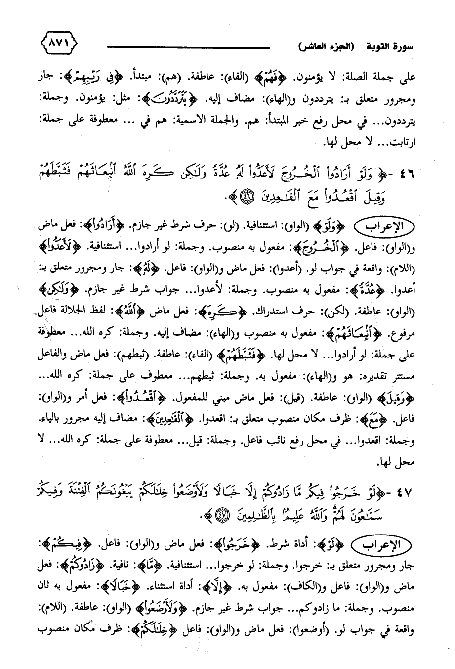 الإعراب {وَلَوْ} (الواو): استئنافية. (لو): حرف شرط غير جازم. {أَرادُوا}: فعل ماض و (الواو): فاعل. {الْخُرُوجَ}: مفعول به منصوب. وجملة: لو أرادوا ... استئنافية. {لَأَعَدُّوا} (اللام): واقعة في جواب لو. (أعدوا): فعل ماض و (الواو): فاعل. {لَهُ}: جار ومجرور متعلق ب: