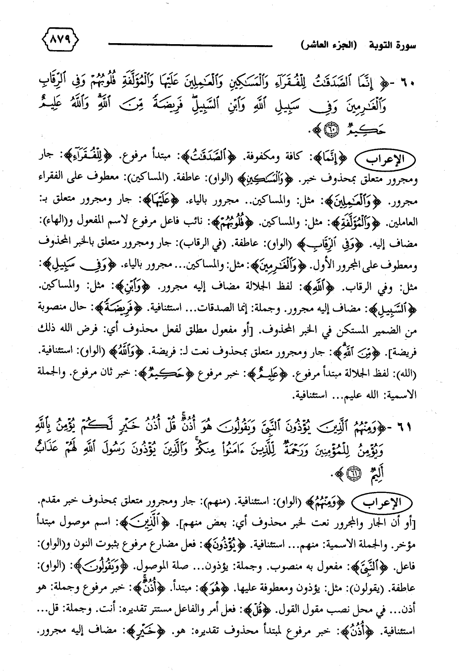 الإعراب {إِنَّمَا}: كافة ومكفوفة. {الصَّدَقاتُ}: مبتدأ مرفوع. {لِلْفُقَراءِ}: جار ومجرور متعلق بمحذوف خبر. {وَالْمَساكِينِ} (الواو): عاطفة. (المساكين): معطوف على الفقراء مجرور. {وَالْعامِلِينَ}: مثل: والمساكين ... مجرور بالياء. {عَلَيْها}: جار ومجرور متعلق ب: