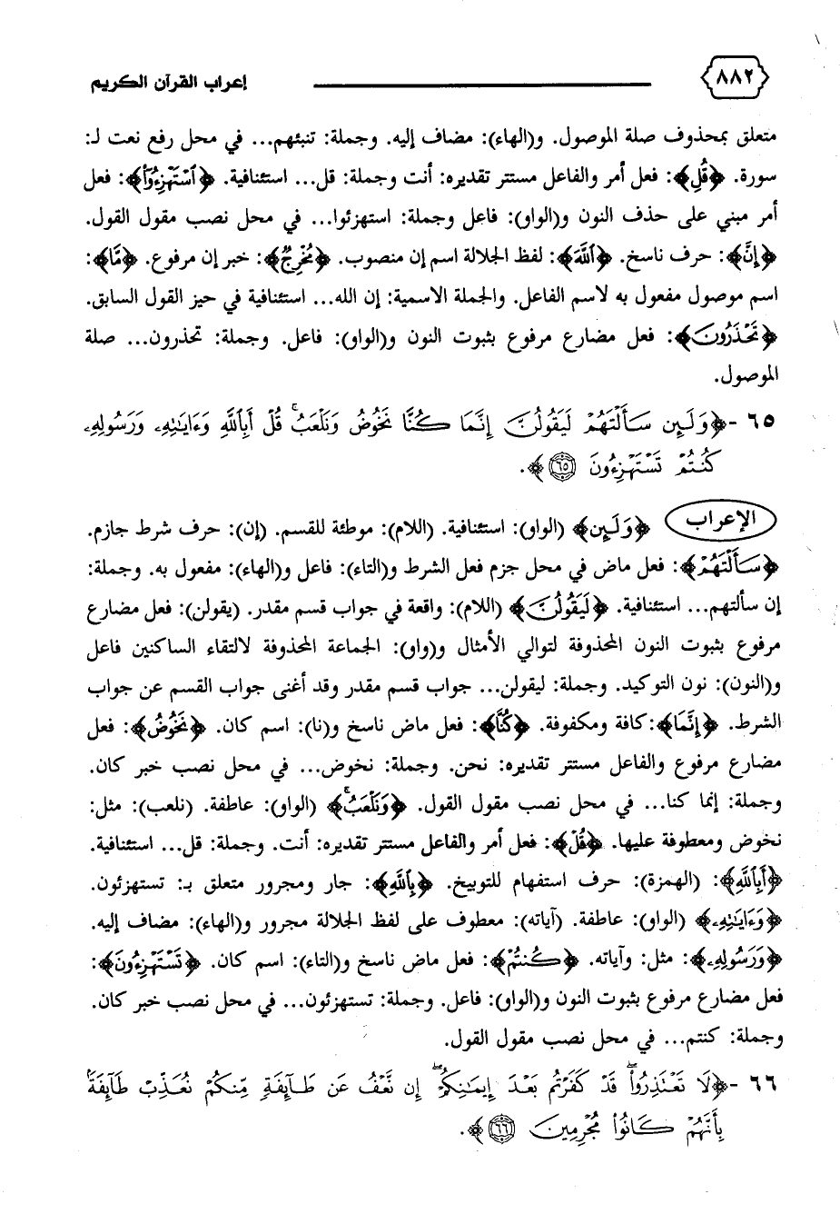 إن سألتهم ... استئنافية. {لَيَقُولُنَّ} (اللام): واقعة في جواب قسم مقدر. (يقولن): فعل مضارع مرفوع بثبوت النون المحذوفة لتوالي الأمثال و (واو): الجماعة المحذوفة لالتقاء الساكنين فاعل و (النون): نون التوكيد. وجملة: ليقولن ... جواب قسم مقدر وقد أغنى جواب القسم عن جواب الشرط. {إِنَّما}: كافة ومكفوفة. {كُنّا}: فعل ماض ناسخ و (نا): اسم كان. {نَخُوضُ}: فعل مضارع مرفوع والفاعل مستتر تقديره: نحن. وجملة: نخوض ... في محل نصب خبر كان.