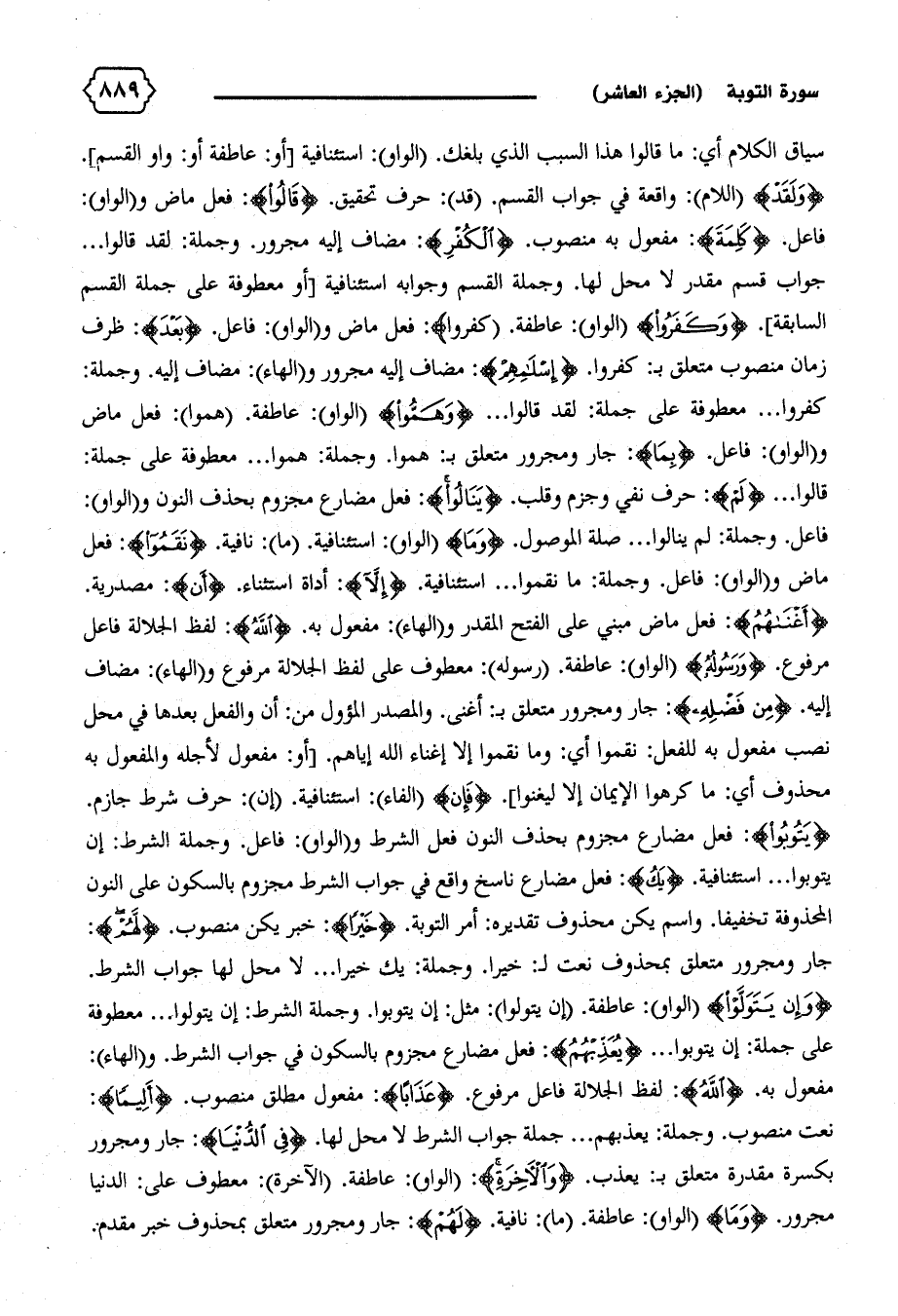 جواب قسم مقدر لا محل لها. وجملة القسم وجوابه استئنافية [أو معطوفة على جملة القسم السابقة]. {وَكَفَرُوا} (الواو): عاطفة. {كَفَرُوا}: فعل ماض و (الواو): فاعل. {بَعْدَ}: ظرف زمان منصوب متعلق ب: كفروا. {إِسْلامِهِمْ}: مضاف إليه مجرور و (الهاء): مضاف إليه. وجملة: