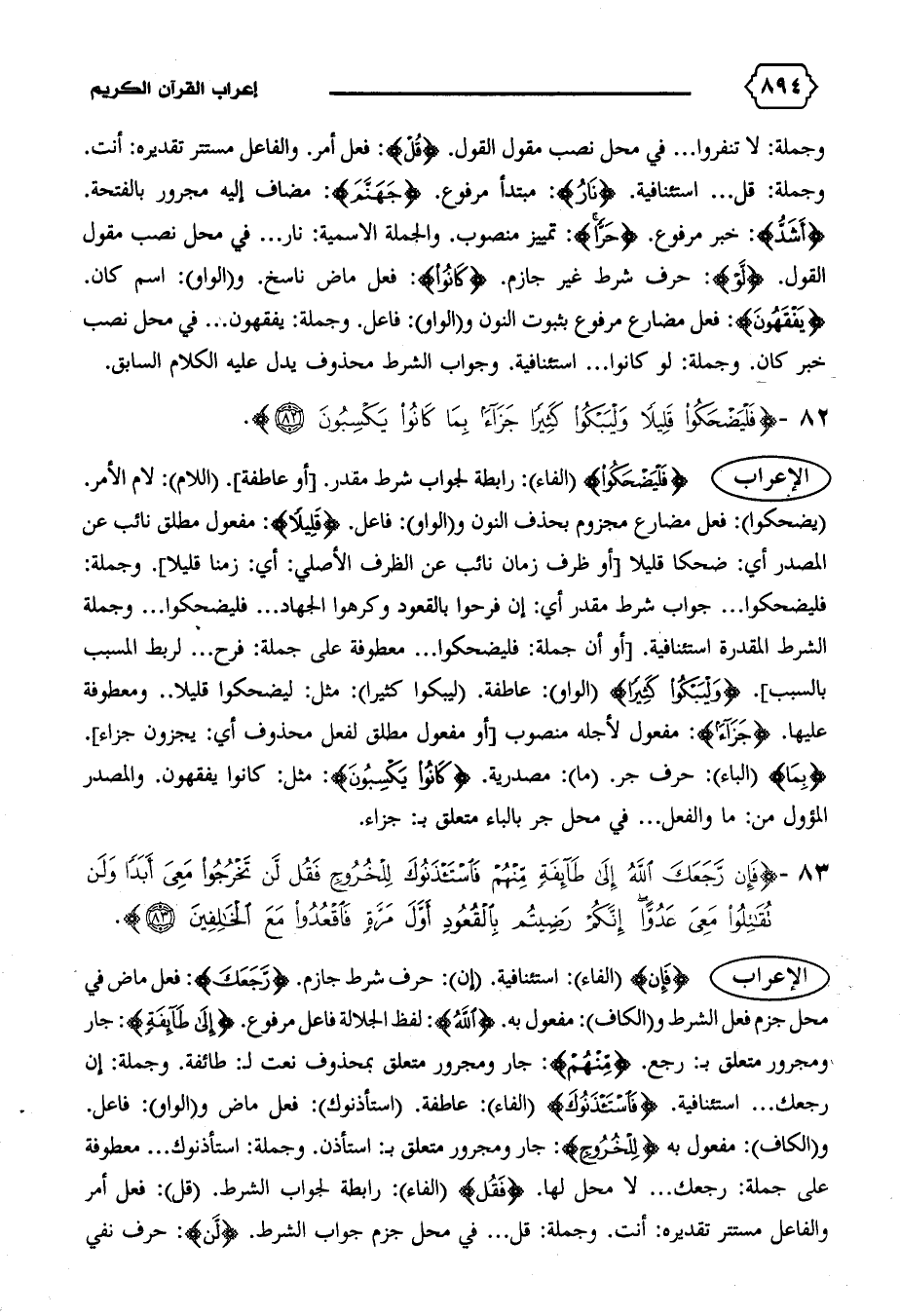 فليضحكوا ... جواب شرط مقدر أي: إن فرحوا بالقعود وكرهوا الجهاد ... فليضحكوا ... وجملة الشرط المقدرة استئنافية. [أو أن جملة: فليضحكوا ... معطوفة على جملة: فرح ... لربط المسبب بالسبب]. {وَلْيَبْكُوا كَثِيراً} (الواو): عاطفة. (ليبكوا كثيرا): مثل: ليضحكوا قليلا ... ومعطوفة عليها. {جَزاءً}: مفعول لأجله منصوب [أو مفعول مطلق لفعل محذوف أي: يجزون جزاء].