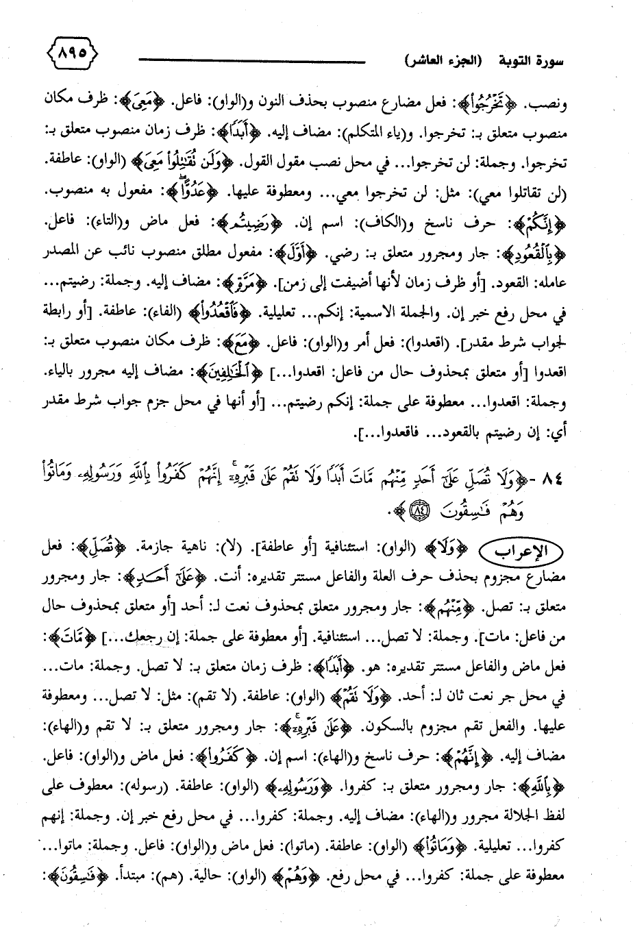 الإعراب {وَلا} (الواو): استئنافية [أو عاطفة]. (لا): ناهية جازمة. {تُصَلِّ}: فعل مضارع مجزوم بحذف حرف العلة والفاعل مستتر تقديره: أنت. {عَلى أَحَدٍ}: جار ومجرور متعلق ب: تصل. {مِنْهُمْ}: جار ومجرور متعلق بمحذوف نعت ل: أحد [أو متعلق بمحذوف حال من فاعل: مات].وجملة: لا تصل ... استئنافية. [أو معطوفة على جملة: إن رجعك ... ] {ماتَ}: