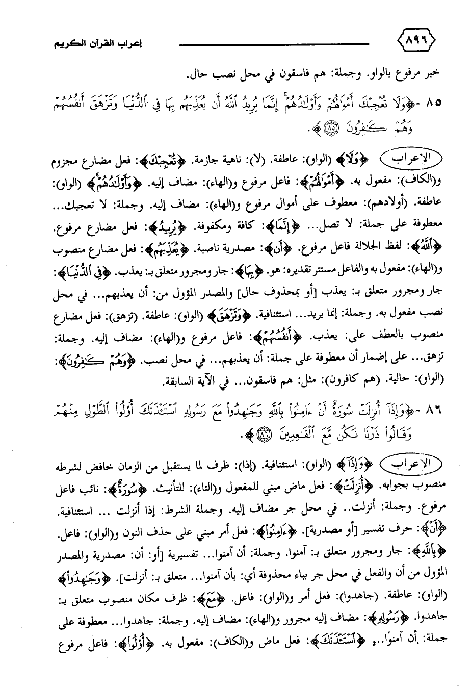 الإعراب {وَلا} (الواو): عاطفة. (لا): ناهية جازمة. {تُعْجِبْكَ}: فعل مضارع مجزوم و (الكاف): مفعول به. {أَمْوالُهُمْ}: فاعل مرفوع و (الهاء): مضاف إليه. {وَأَوْلادُهُمْ} (الواو):