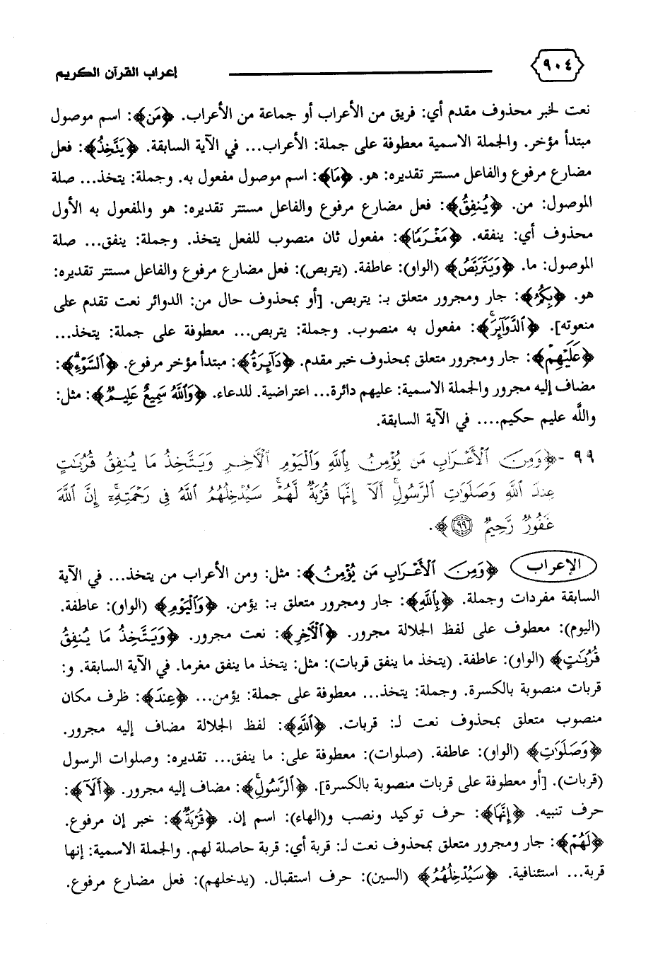 نعت لخبر محذوف مقدم أي: فريق من الأعراب أو جماعة من الأعراب. {مِنَ}: اسم موصول مبتدأ مؤخر. والجملة الاسمية معطوفة على جملة: الأعراب ... في الآية السابقة. {يَتَّخِذُ}: فعل مضارع مرفوع والفاعل مستتر تقديره: هو. {ما}: اسم موصول مفعول به. وجملة: يتخذ ... صلة الموصول: من. {يُنْفِقُ}: فعل مضارع مرفوع والفاعل مستتر تقديره: هو والمفعول به الأول محذوف أي: ينفقه. {مَغْرَماً}: مفعول ثان منصوب للفعل يتخذ. وجملة: ينفق ... صلة الموصول: ما. {وَيَتَرَبَّصُ} (الواو): عاطفة. (يتربص): فعل مضارع مرفوع والفاعل مستتر تقديره: