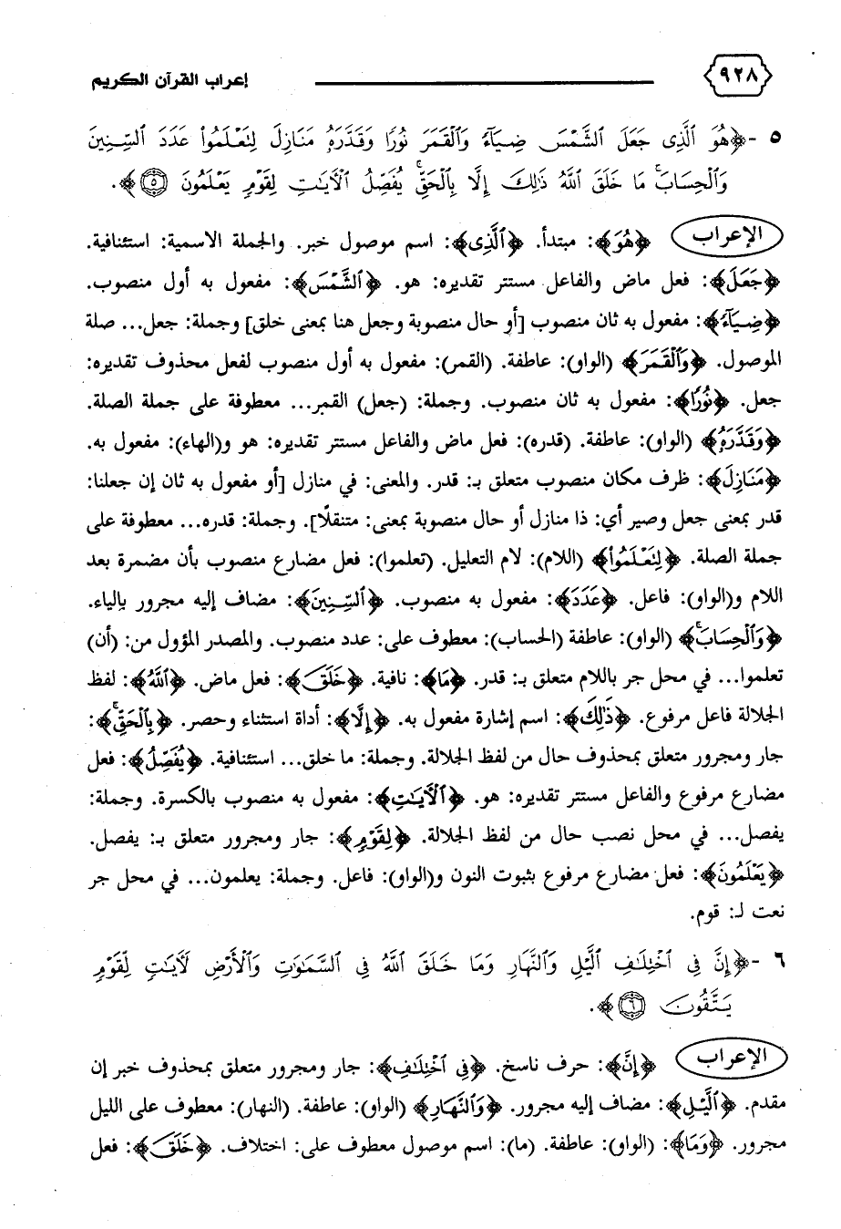 {ضِياءً}: مفعول به ثان منصوب [أو حال منصوبة وجعل هنا بمعنى خلق] وجملة: جعل ... صلة الموصول. {وَالْقَمَرَ} (الواو): عاطفة. (القمر): مفعول به أول منصوب لفعل محذوف تقديره: