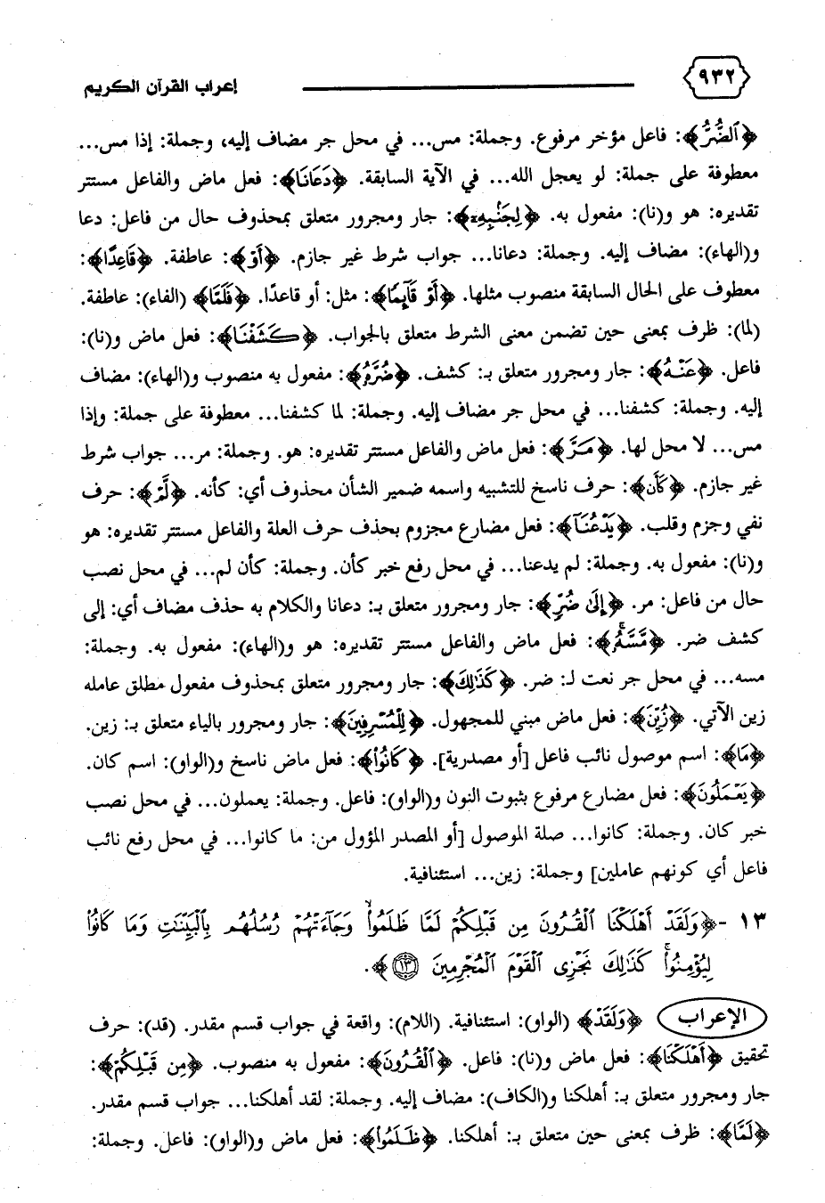 الإعراب {وَلَقَدْ} (الواو): استئنافية. (اللام): واقعة في جواب قسم مقدر. (قد): حرف تحقيق {أَهْلَكْنَا}: فعل ماض و (نا): فاعل. {الْقُرُونَ}: مفعول به منصوب. {مِنْ قَبْلِكُمْ}: