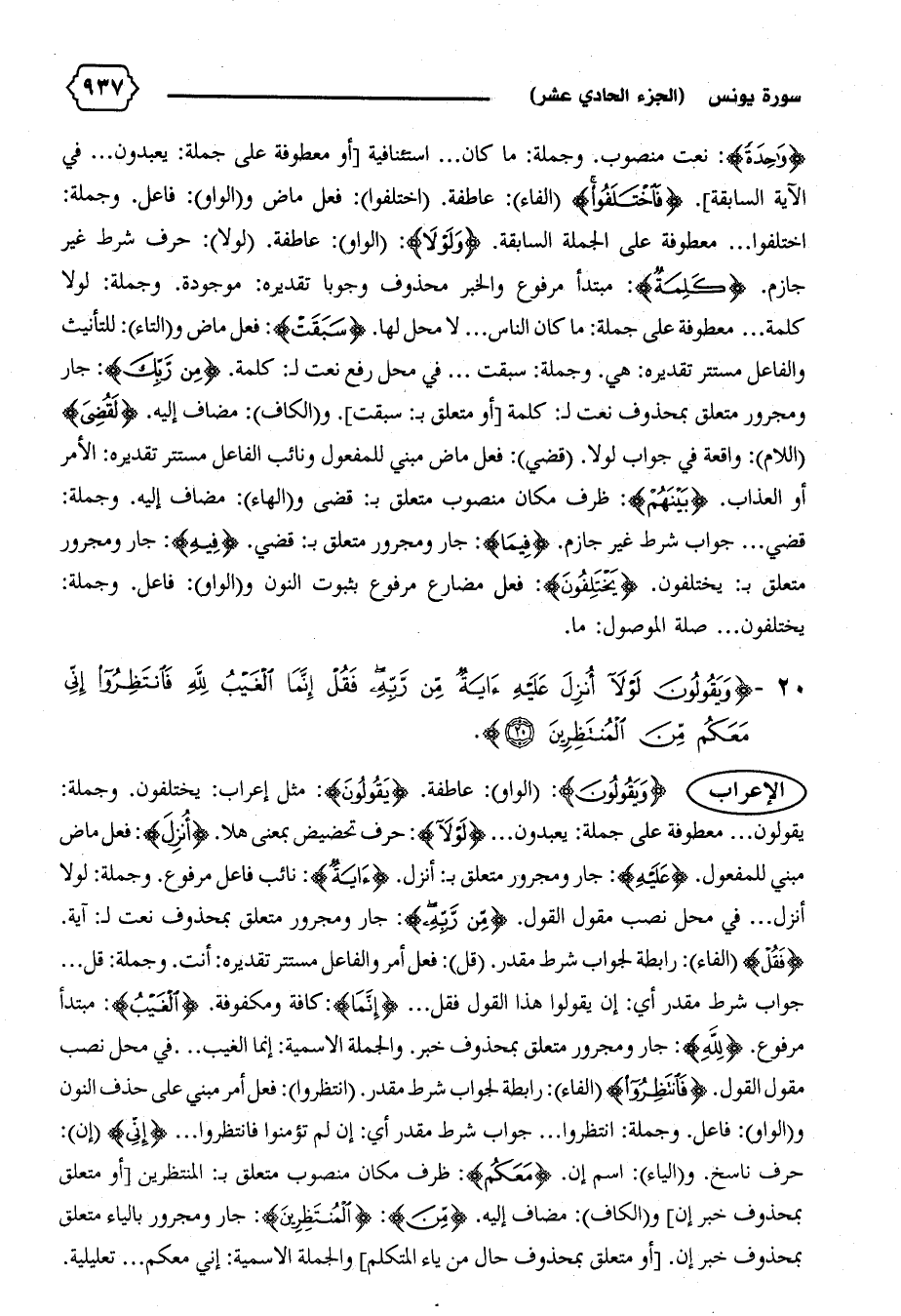 اختلفوا ... معطوفة على الجملة السابقة. {وَلَوْلا}: (الواو): عاطفة. (لولا): حرف شرط غير جازم. {كَلِمَةٌ}: مبتدأ مرفوع والخبر محذوف وجوبا تقديره: موجودة. وجملة: لولا كلمة ... معطوفة على جملة: ما كان الناس .... لا محل لها. {سَبَقَتْ}: فعل ماض و (التاء): للتأنيث والفاعل مستتر تقديره: هي. وجملة: سبقت ... في محل رفع نعت ل: كلمة. {مِنْ رَبِّكَ}: جار ومجرور متعلق بمحذوف نعت ل: كلمة [أو متعلق ب: سبقت].و (الكاف): مضاف إليه. {لَقُضِيَ} (اللام): واقعة في جواب لولا. (قضي): فعل ماض مبني للمفعول ونائب الفاعل مستتر تقديره: الأمر أو العذاب. {بَيْنَهُمْ}: ظرف مكان منصوب متعلق ب: قضى و (الهاء): مضاف إليه. وجملة: