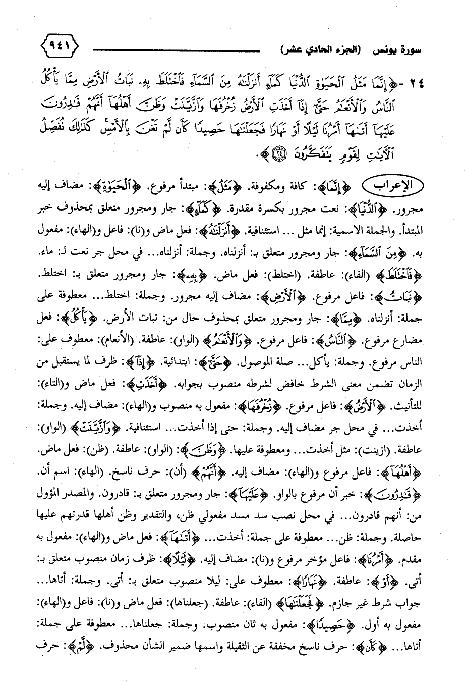 {إِنَّما مَثَلُ الْحَياةِ الدُّنْيا كَماءٍ أَنْزَلْناهُ مِنَ السَّماءِ فَاخْتَلَطَ بِهِ نَباتُ الْأَرْضِ مِمّا يَأْكُلُ النّاسُ وَالْأَنْعامُ حَتّى إِذا أَخَذَتِ الْأَرْضُ زُخْرُفَها وَاِزَّيَّنَتْ وَظَنَّ أَهْلُها أَنَّهُمْ قادِرُونَ عَلَيْها أَتاها أَمْرُنا لَيْلاً أَوْ نَهاراً فَجَعَلْناها حَصِيداً كَأَنْ لَمْ تَغْنَ بِالْأَمْسِ كَذلِكَ نُفَصِّلُ الْآياتِ لِقَوْمٍ يَتَفَكَّرُونَ (٢٤)}