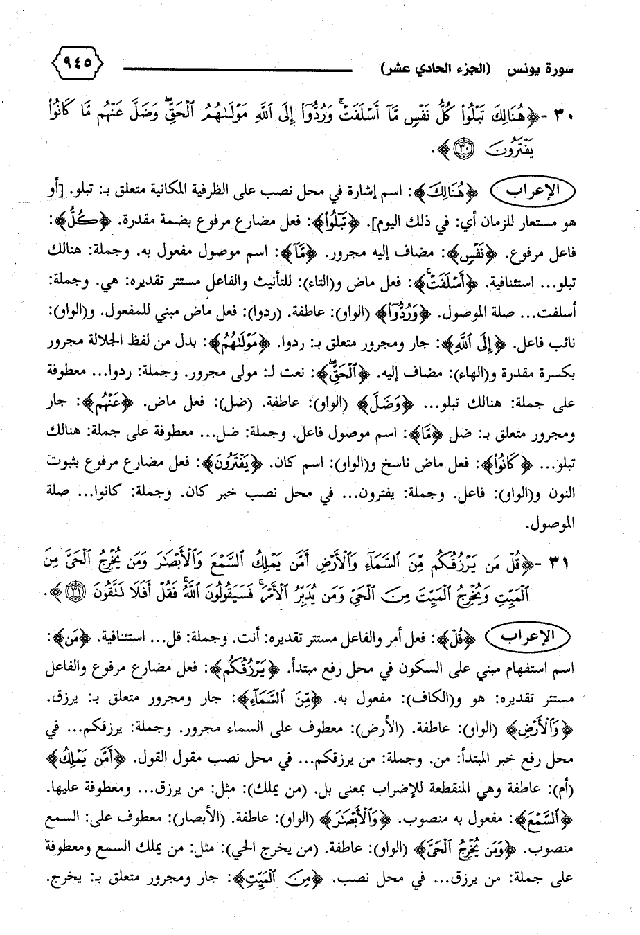 نائب فاعل. {إِلَى اللهِ}: جار ومجرور متعلق ب: ردوا. {مَوْلاهُمُ}: بدل من لفظ الجلالة مجرور بكسرة مقدرة و (الهاء): مضاف إليه. {الْحَقِّ}: نعت ل: مولى مجرور. وجملة: ردوا ... معطوفة على جملة: هنالك تبلو ... {وَضَلَّ} (الواو): عاطفة. (ضل): فعل ماض. {عَنْهُمْ}: جار ومجرور متعلق ب: ضل {ما}: اسم موصول فاعل. وجملة: ضل ... معطوفة على جملة: هنالك تبلو ... {كانُوا}: فعل ماض ناسخ و (الواو): اسم كان. {يَفْتَرُونَ}: فعل مضارع مرفوع بثبوت النون و (الواو): فاعل. وجملة: يفترون ... في محل نصب خبر كان. وجملة: كانوا ... صلة الموصول.