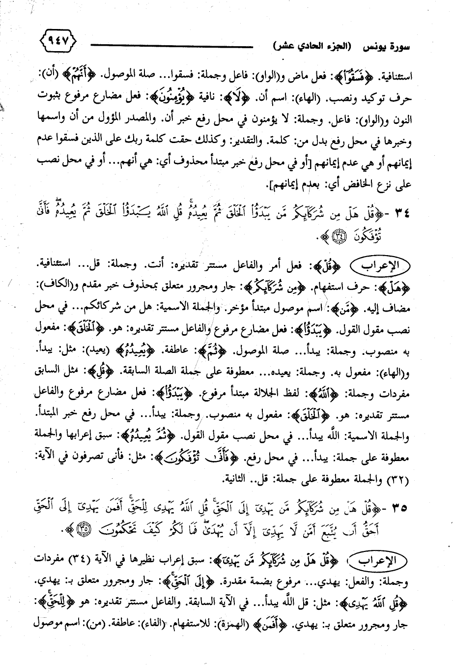 الإعراب {قُلْ هَلْ مِنْ شُرَكائِكُمْ مَنْ يَهْدِي}: سبق إعراب نظيرها في الآية (٣٤) مفردات وجملة: والفعل: يهدي ... مرفوع بضمة مقدرة. {إِلَى الْحَقِّ}: جار ومجرور متعلق ب: يهدي.