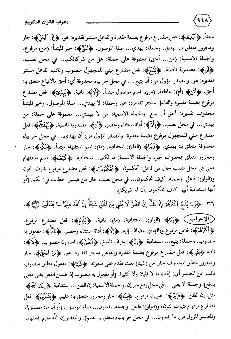 أحق. {أَمَّنْ} (أم): عاطفة. (من): اسم موصول مبتدأ. {لا}: نافية. {يَهْدِي}: فعل مضارع مرفوع بضمة مقدرة والفاعل مستتر تقديره: هو. وجملة: لا يهدي ... صلة الموصول. وخبر المبتدأ محذوف تقديره: أحق أن يتبع. والجملة الاسمية: من لا يهدي ... معطوفة على جملة: من يهدي ... في محل نصب. {إِلاّ}: أداة استثناء وحصر. {أَنْ}: مصدرية ناصبة. {يَهْدِي}: فعل مضارع مبني للمجهول مرفوع بضمة مقدرة. والمصدر المؤول من: أن يهدى ... في محل جر بباء محذوفة متعلق ب: يهدي. {فَما} (الفاء): استئنافية. (ما): اسم استفهام مبتدأ. {لَكُمْ}: جار ومجرور متعلق بمحذوف خبر، والجملة الاسمية: ما لكم ... استئنافية. {كَيْفَ}: اسم استفهام مبني في محل نصب حال من فاعل: تحكمون. {تَحْكُمُونَ}: فعل مضارع مرفوع بثبوت النون و (الواو): فاعل. وجملة: كيف تحكمون ... في محل نصب حال من ضمير الخطاب في: لكم. [أو أنها استئنافية أي: كيف تحكمون بأن له شريكا].