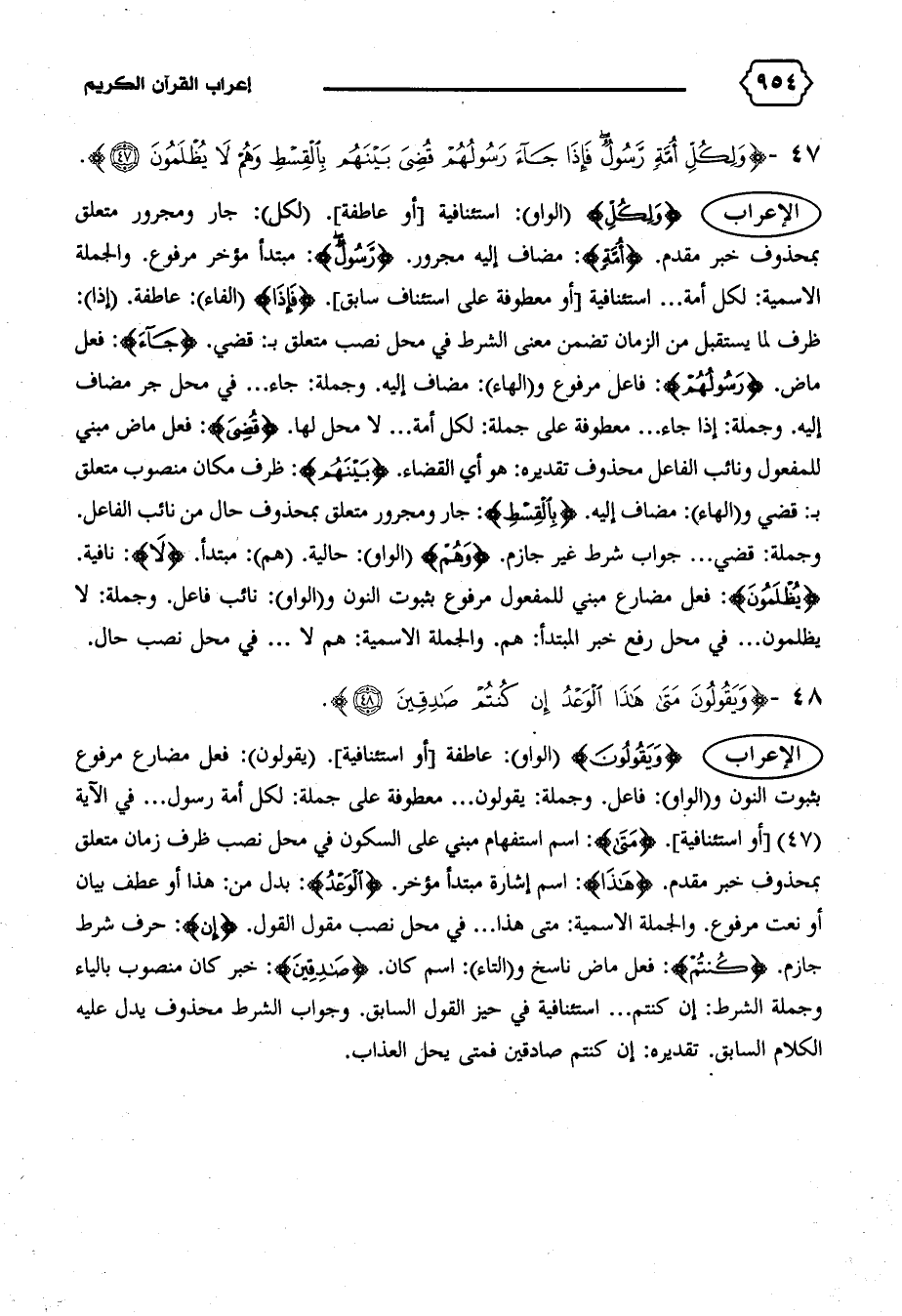 الإعراب {وَيَقُولُونَ} (الواو): عاطفة [أو استئنافية]. (يقولون): فعل مضارع مرفوع بثبوت النون و (الواو): فاعل. وجملة: يقولون ... معطوفة على جملة: لكل أمة رسول ... في الآية (٤٧) [أو استئنافية]. {مَتى}: اسم استفهام مبني على السكون في محل نصب ظرف زمان متعلق بمحذوف خبر مقدم. {هذَا}: اسم إشارة مبتدأ مؤخر. {الْوَعْدُ}: بدل من: هذا أو عطف بيان أو نعت مرفوع. والجملة الاسمية: متى هذا ... في محل نصب مقول القول. {إِنْ}: حرف شرط جازم. {كُنْتُمْ}: فعل ماض ناسخ و (التاء): اسم كان. {صادِقِينَ}: خبر كان منصوب بالياء وجملة الشرط: إن كنتم ... استئنافية في حيز القول السابق. وجواب الشرط محذوف يدل عليه الكلام السابق. تقديره: إن كنتم صادقين فمتى يحل العذاب.