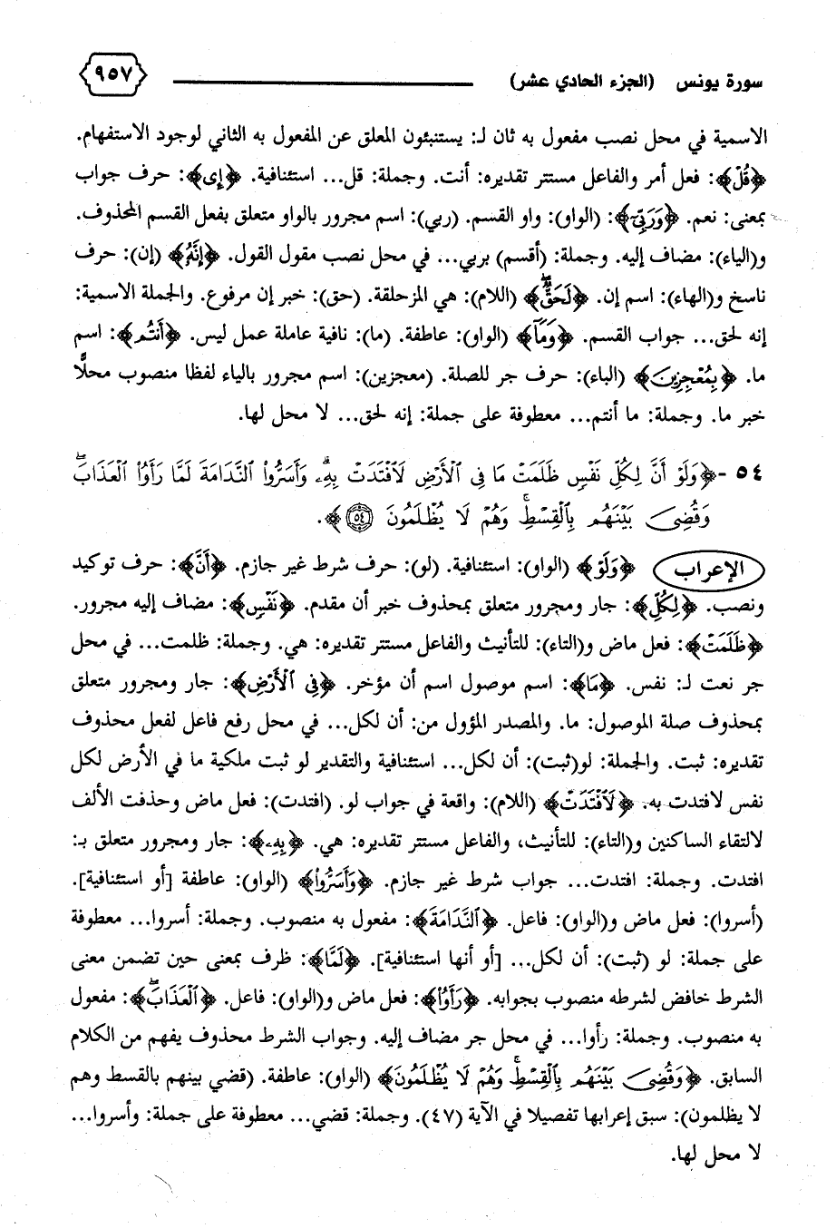 (أسروا): فعل ماض و (الواو): فاعل. {النَّدامَةَ}: مفعول به منصوب. وجملة: أسروا ... معطوفة على جملة: لو (ثبت): أن لكل ... [أو أنها استئنافية]. {لَمّا}: ظرف بمعنى حين تضمن معنى الشرط خافض لشرطه منصوب بجوابه. {رَأَوُا}: فعل ماض و (الواو): فاعل. {الْعَذابَ}: مفعول به منصوب. وجملة: رأوا ... في محل جر مضاف إليه. وجواب الشرط محذوف يفهم من الكلام السابق. {وَقُضِيَ بَيْنَهُمْ بِالْقِسْطِ وَهُمْ لا يُظْلَمُونَ} (الواو): عاطفة. (قضي بينهم بالقسط وهم لا يظلمون): سبق إعرابها تفصيلا في الآية (٤٧).وجملة: قضي ... معطوفة على جملة: وأسروا