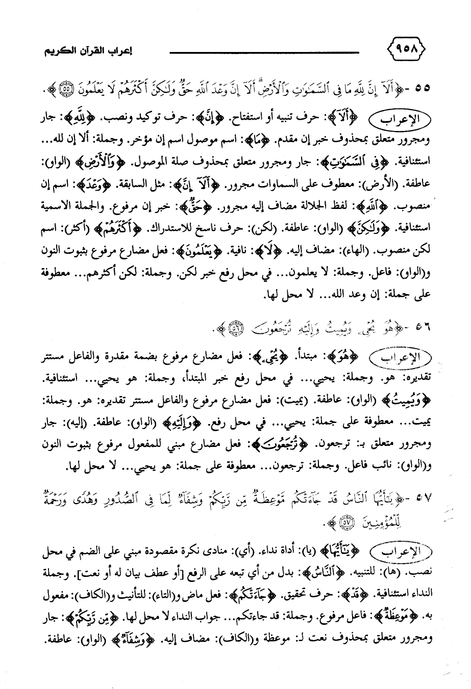 الإعراب {يا أَيُّهَا} (يا): أداة نداء. (أي): منادى نكرة مقصودة مبني على الضم في محل نصب. (ها): للتنبيه. {النّاسُ}: بدل من أي تبعه على الرفع [أو عطف بيان له أو نعت].وجملة النداء استئنافية. {قَدْ}: حرف تحقيق. {جاءَتْكُمْ}: فعل ماض و (التاء): للتأنيث و (الكاف): مفعول به. {مَوْعِظَةٌ}: فاعل مرفوع. وجملة: قد جاءتكم ... جواب النداء لا محل لها. {مِنْ رَبِّكُمْ}: جار ومجرور متعلق بمحذوف نعت ل: موعظة و (الكاف): مضاف إليه. {وَشِفاءٌ} (الواو): عاطفة.