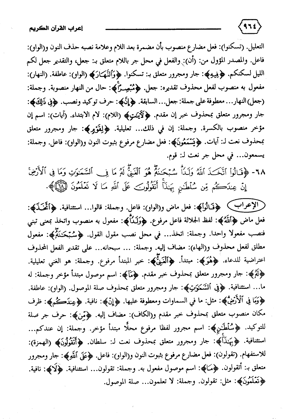فعل ماض {اللهُ}: لفظ الجلالة فاعل مرفوع. {وَلَداً}: مفعول به منصوب واتخذ بمعنى تبني فنصب مفعولا واحدا. وجملة: اتخذ ... في محل نصب مقول القول. {سُبْحانَهُ}: مفعول مطلق لفعل محذوف و (الهاء): مضاف إليه. وجملة: ... سبحانه ... على تقدير الفعل المحذوف اعتراضية للدعاء. {هُوَ}: مبتدأ. {الْغَنِيُّ}: خبر المبتدأ مرفوع. وجملة: هو الغني تعليلية.