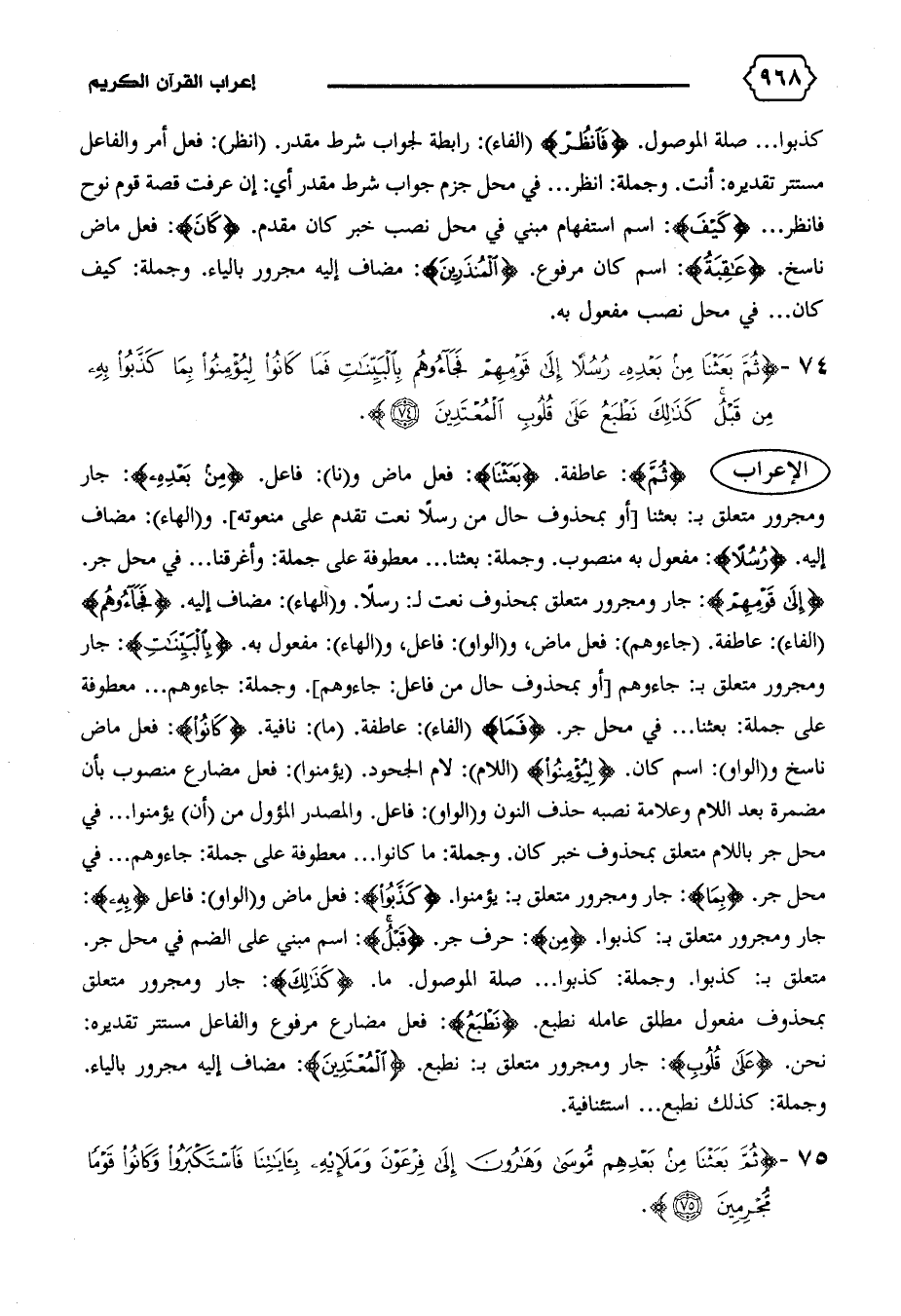 الإعراب {ثُمَّ}: عاطفة. {بَعَثْنا}: فعل ماض و (نا): فاعل. {مِنْ بَعْدِهِ}: جار ومجرور متعلق ب: بعثنا [أو بمحذوف حال من رسلا نعت تقدم على منعوته].و (الهاء): مضاف إليه. {رُسُلاً}: مفعول به منصوب. وجملة: بعثنا ... معطوفة على جملة: وأغرقنا ... في محل جر.
