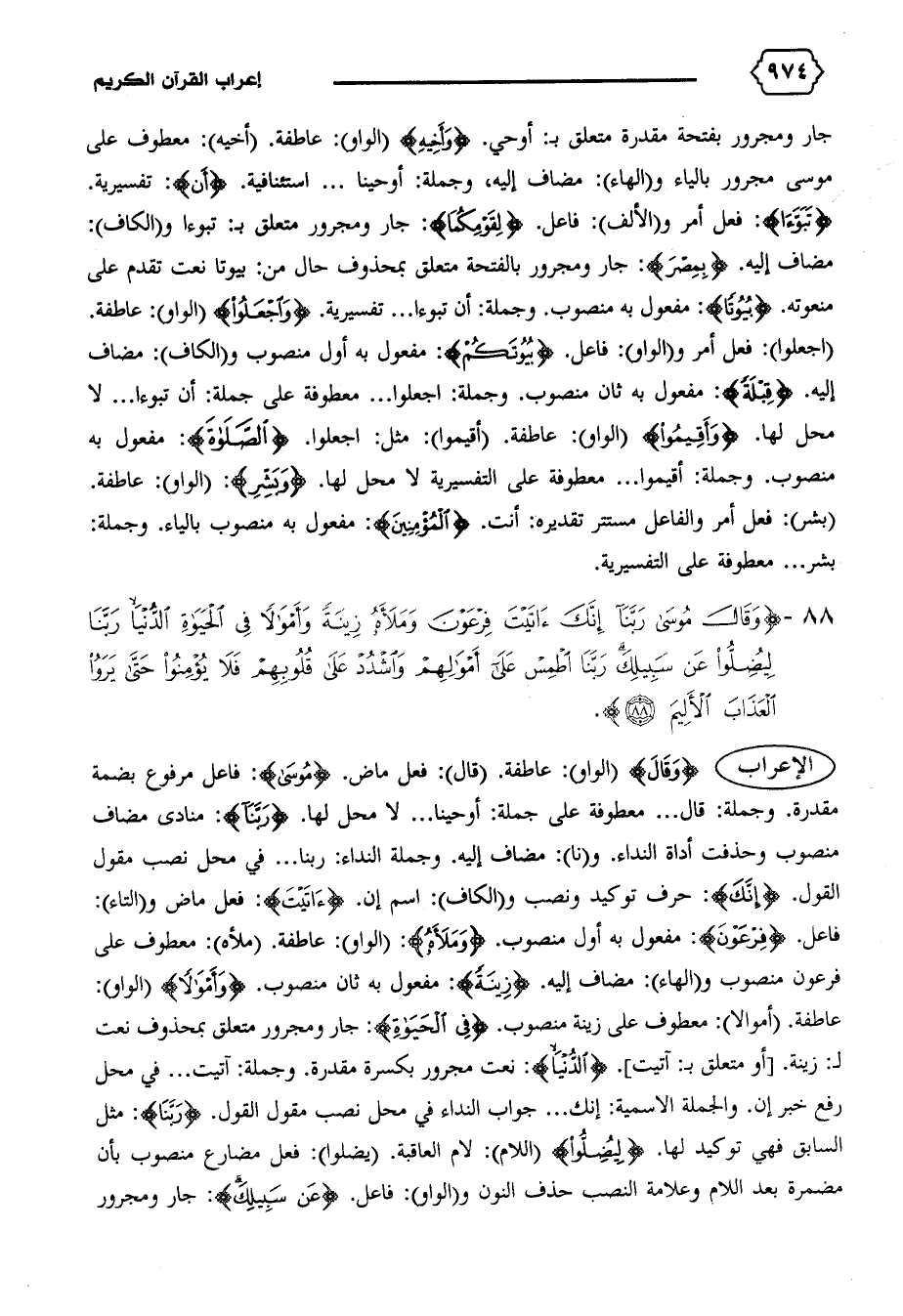 عاطفة. (أموالا): معطوف على زينة منصوب. {فِي الْحَياةِ}: جار ومجرور متعلق بمحذوف نعت ل: زينة. [أو متعلق ب: آتيت]. {الدُّنْيا}: نعت مجرور بكسرة مقدرة. وجملة: آتيت ... في محل رفع خبر إن. والجملة الاسمية: إنك ... جواب النداء في محل نصب مقول القول. {رَبَّنا}: مثل السابق فهي توكيد لها. {لِيُضِلُّوا} (اللام): لام العاقبة. (يضلوا): فعل مضارع منصوب بأن مضمرة بعد اللام وعلامة النصب حذف النون و (الواو): فاعل. {عَنْ سَبِيلِكَ}: جار ومجرور