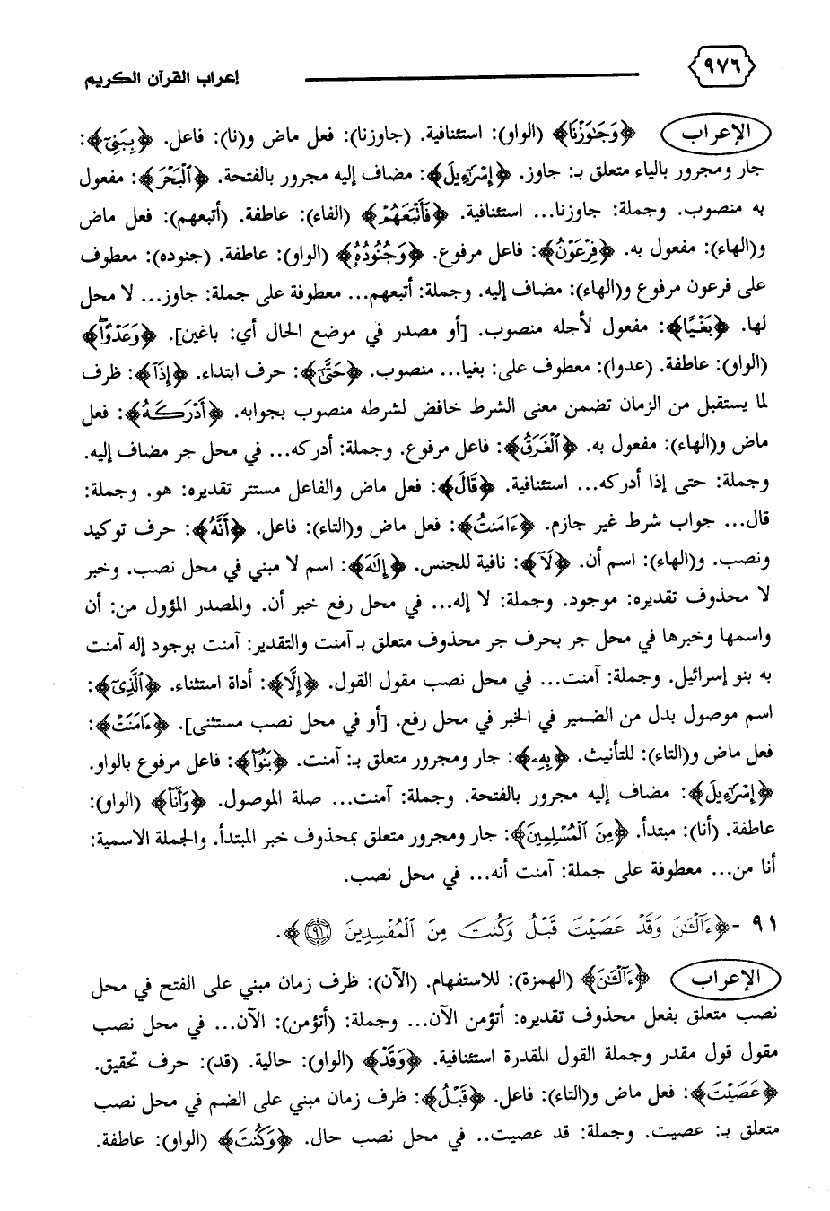 جار ومجرور بالياء متعلق ب: جاوز. {إِسْرائِيلَ}: مضاف إليه مجرور بالفتحة. {الْبَحْرَ}: مفعول به منصوب. وجملة: جاوزنا ... استئنافية. {فَأَتْبَعَهُمْ} (الفاء): عاطفة. (أتبعهم): فعل ماض و (الهاء): مفعول به. {فِرْعَوْنُ}: فاعل مرفوع. {وَجُنُودُهُ} (الواو): عاطفة. (جنوده): معطوف على فرعون مرفوع و (الهاء): مضاف إليه. وجملة: أتبعهم ... معطوفة على جملة: جاوز ... لا محل لها. {بَغْياً}: مفعول لأجله منصوب. [أو مصدر في موضع الحال أي: باغين]. {وَعَدْواً} (الواو): عاطفة. (عدوا): معطوف على: بغيا ... منصوب. {حَتّى}: حرف ابتداء. {إِذا}: ظرف لما يستقبل من الزمان تضمن معنى الشرط خافض لشرطه منصوب بجوابه. {أَدْرَكَهُ}: فعل ماض و (الهاء): مفعول به. {الْغَرَقُ}: فاعل مرفوع. وجملة: أدركه ... في محل جر مضاف إليه.