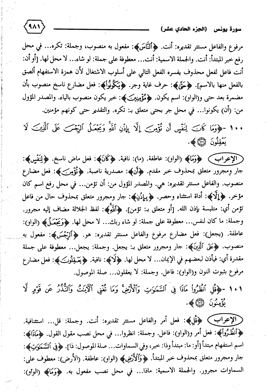 عاطفة. (يجعل): فعل مضارع مرفوع والفاعل مستتر تقديره: هو. {الرِّجْسَ}: مفعول به منصوب. {عَلَى الَّذِينَ}: جار ومجرور متعلق ب: يجعل. وجملة: يجعل ... معطوفة على جملة مقدرة أي: فيأذن لبعضهم في الإيمان ... لا محل لها. {لا}: نافية. {يَعْقِلُونَ}: فعل مضارع مرفوع بثبوت النون و (الواو): فاعل. وجملة: لا يعقلون ... صلة الموصول.