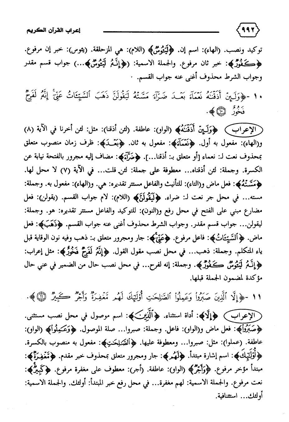 الإعراب {وَلَئِنْ أَذَقْناهُ} (الواو): عاطفة. (لئن أذقنا): مثل: لئن أخرنا في الآية (٨) و (الهاء): مفعول به أول. {نَعْماءَ}: مفعول به ثان. {بَعْدَ}: ظرف زمان منصوب متعلق بمحذوف نعت ل: نعماء [أو متعلق ب: أذقنا ... ]. {ضَرّاءَ}: مضاف إليه مجرور بالفتحة نيابة عن الكسرة. وجملة: لئن أذقناه ... معطوفة على جملة: لئن قلت ... في الآية (٧) لا محل لها.