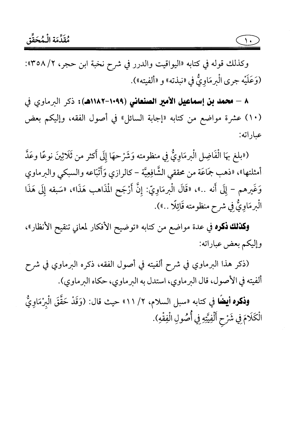 8 - محمد بن إسماعيل الأمير الصنعاني (1099 - 1182 هـ): ذكر البرماوي في (10) عشرة مواضع من كتابه "إجابة السائل" في أصول الفقه، وإليكم بعض عباراته: