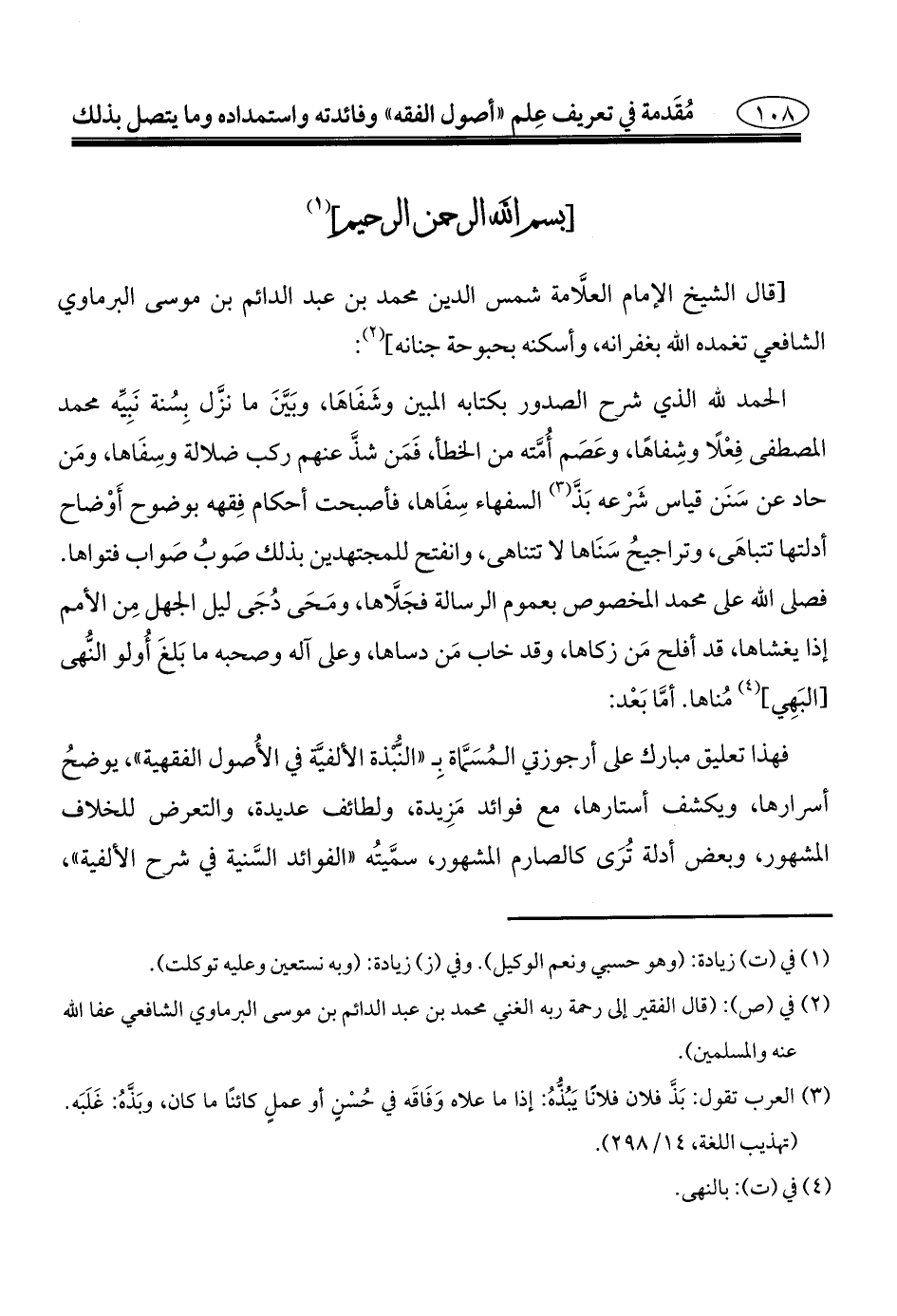 [قال الشيخ الإمام العلَّامة شمس الدين محمد بن عبد الدائم بن موسى البرماوي الشافعي تغمده الله بغفرانه، وأسكنه بحبوحة جنانه] (¬2):