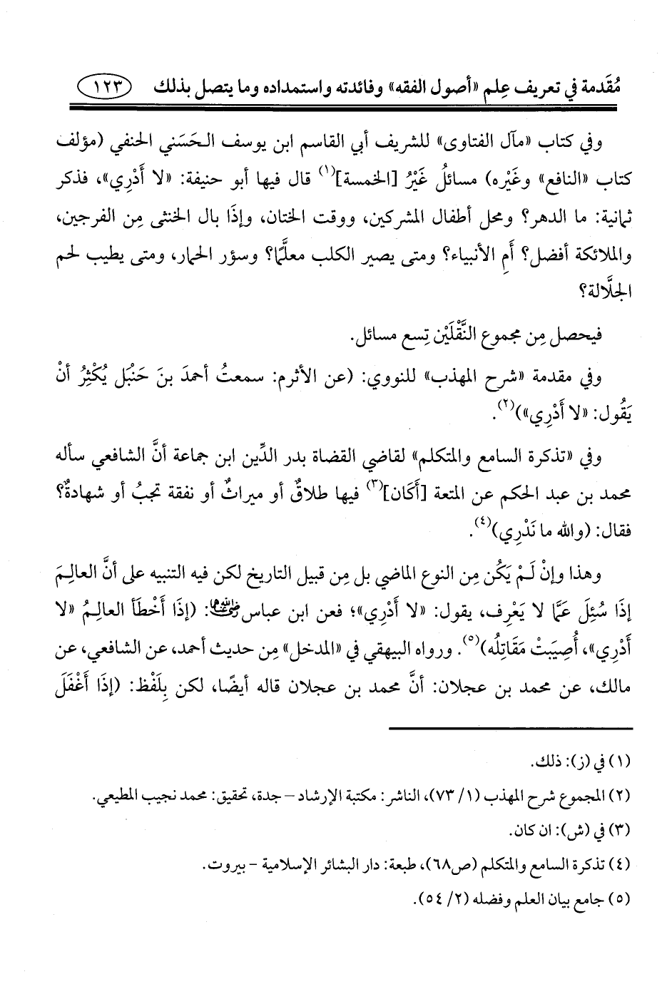 وفي مقدمة "شرح المهذب" للنووي: (عن الأثرم: سمعتُ أحمدَ بنَ حَنْبَل يُكْثِرُ أنْ يَقُول: "لا أَدْرِي") (¬2).