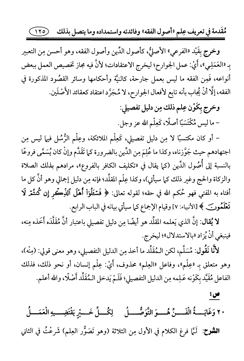 وخرج بِقَيْد "الفرعي" الأصليُّ، كأصول الدِّين وأصول الفقه، وهو أحسن مِن التعبير بِـ "العَمَلِي"، أَيْ: عمل الجوارح؛ ليخرج الاعتقادات؛ لأنَّ فيه مجاز تخصيص العمل ببعض أنواعه، فَمِن الفقه ما ليس بعمل جارحة، كالنيَّة وأحكامها وسائر القصُود المذكورة في الفقه، إلَّا أنْ يُجاب بأنه تابع لأفعال الجوارح، لا مُجَرَّد اعتقاد كعقائد الأَصْلَين.