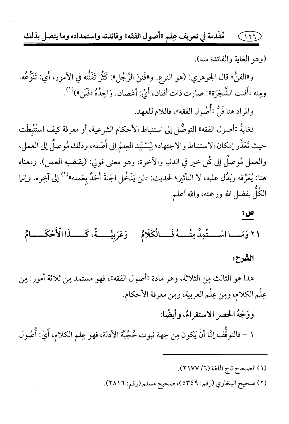 21 - وَمَا اسْتُمِدَّ مِنْهُ فَالْكَلَامُ ... وَعَرَبِيَّةٌ، كَذَا الْأَحْكَامُ