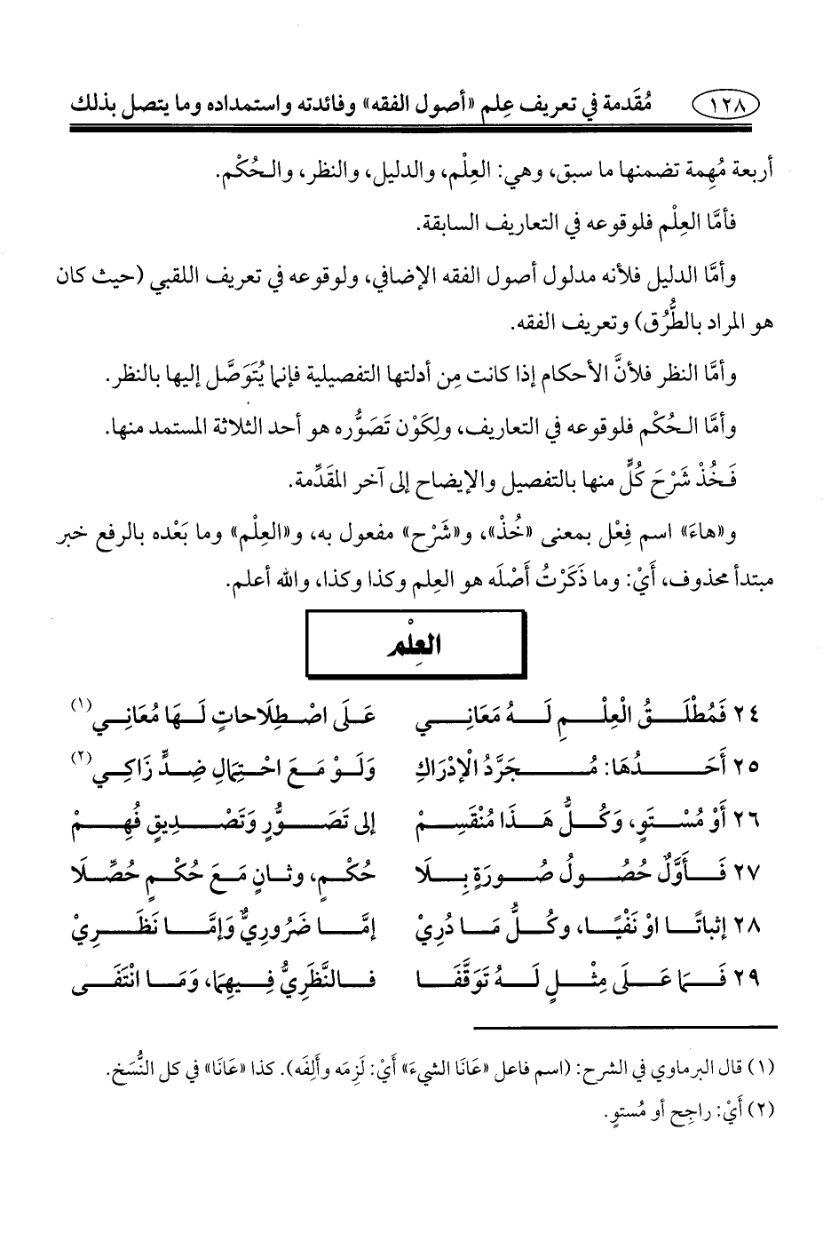 24 - فَمُطْلَقُ الْعِلْمِ لَهُ مَعَانِي ... عَلَى اصْطِلَاحاتٍ لَها مُعَانِي (¬1)