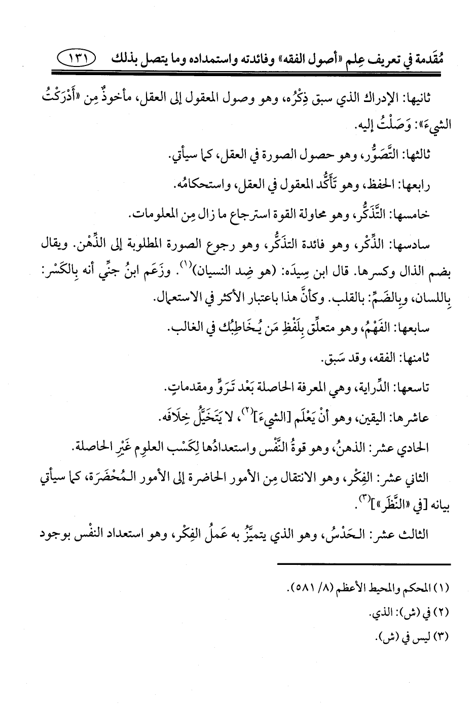 سادسها: الذِّكْر، وهو فائدة التذَكُّر، وهو رجوع الصورة المطلوبة إلى الذِّهْن. ويقال بضم الذال وكسرها. قال ابن سِيدَه: (هو ضِد النسيان) (¬1). وزَعَم ابنُ جنِّي أنه بِالكَسْر: بِاللسان، وبِالضَمِّ: بالقلب. وكأنَّ هذا باعتبار الأكثر في الاستعمال.