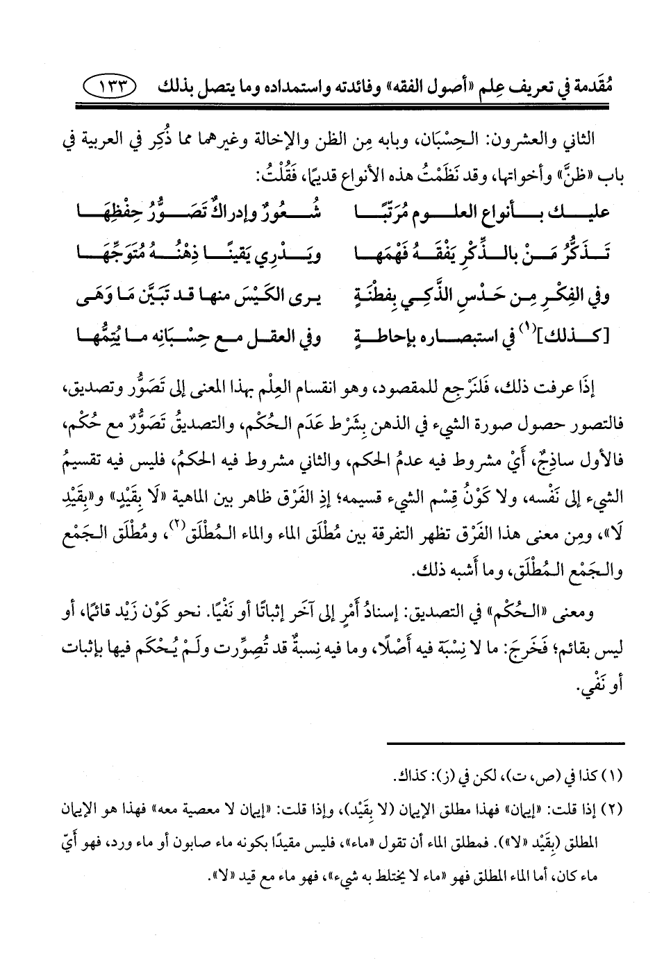 إذَا عرفت ذلك، فَلنَرْجِع للمقصود، وهو انقسام العِلْم بهذا المعنى إلى تَصَوُّر وتصديق، فالتصور حصول صورة الشيء في الذهن بِشَرْط عَدَم الحُكْم، والتصديقُ تَصَوُّرٌ مع حُكْم، فالأول ساذِجٌ، أَيْ مشروط فيه عدمُ الحكم، والثاني مشروط فيه الحكمُ، فليس فيه تقسيمُ الشيء إلى نَفْسه، ولا كَوْنُ قِسْم الشيء قسيمه؛ إذِ الفَرْق ظاهر بين الماهية "لَا بِقَيْدٍ" و"بِقَيْدِ لَا"، ومن معنى هذا الفَرْق تظهر التفرقة بين مُطْلَق الماء والماء المُطْلَق (¬2)، ومُطْلَق الجَمْع والجَمْع المُطْلَق، وما أَشبه ذلك.