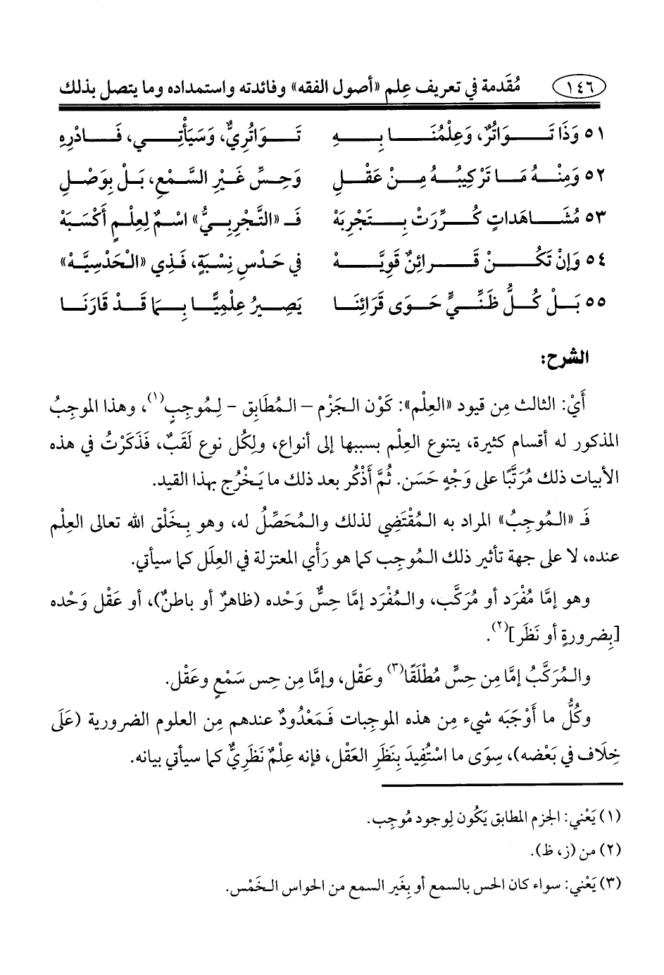 أَيْ: الثالث مِن قيود "العِلْم": كَوْن الجَزْم - المُطَابِق - لِمُوجِبٍ (¬1)، وهذا الموجِبُ المذكور له أقسام كثيرة، يتنوع العِلْم بسببها إلى أنواع، ولِكُل نوع لَقَبٌ، فَذَكَرْتُ في هذه الأبيات ذلك مُرَتَّبًا على وَجْهٍ حَسَن. ثُمَّ أَذْكُر بعد ذلك ما يَخْرُج بهذا القيد.
