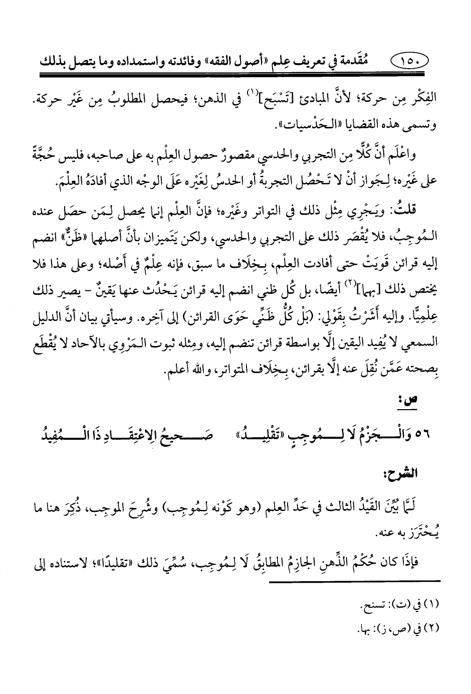 56 - وَالْجَزْمُ لَا لِمُوجِبٍ "تَقْلِيدُ" ... صَحيحُ الِاعْتِقَادِ ذَا الْمُفِيدُ
