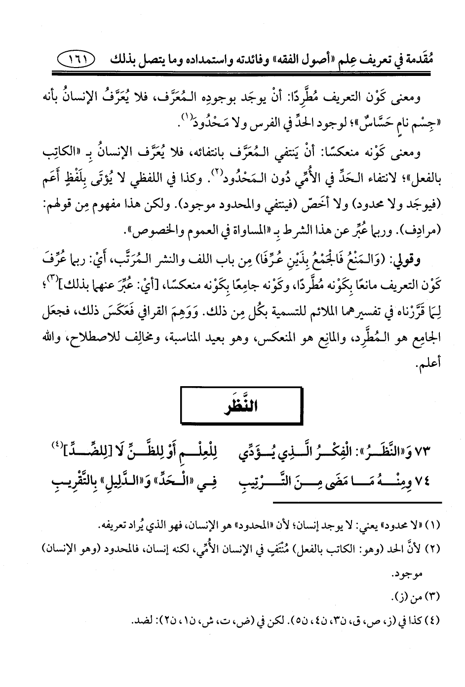 وقولي: (وَالمَنْعُ فَالْجَمْعُ بِذَيْنِ عُرِّفَا) مِن باب اللف والنشر المُرَتَّب، أَيْ: ربما عُرِّفَ كَوْن التعريف مانعًا بِكَوْنه مُطَّردًا، وكَوْنه جامِعًا بِكَوْنه منعكسًا، [أيْ: عُبِّرَ عنهما بذلك] (¬3)؛ لِمَا قَرَّرْناه في تفسيرهما الملائم للتسمية بكُل مِن ذلك. وَوَهِمَ القرافي فَعَكَسَ ذلك، فجعَل الجامِع هو المُطَّرِد، والمانِع هو المنعكس، وهو بعيد المناسبة، ومخالِف للاصطلاح، والله أعلم.
