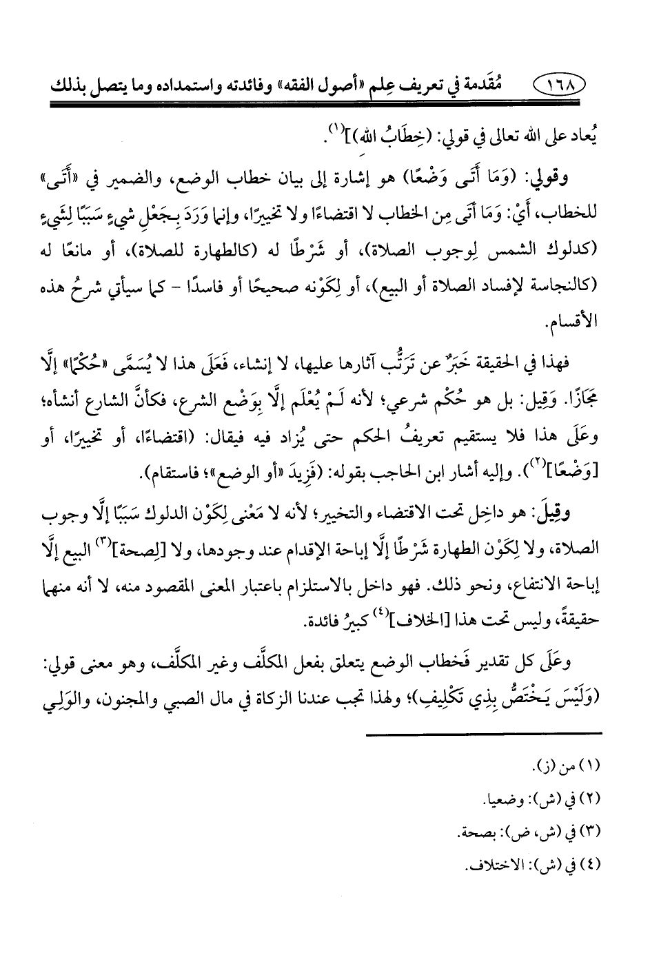 فهذا في الحقيقة خَبَرٌ عن تَرَتُّب آثارها عليها، لا إنشاء، فَعَلَى هذا لا يُسَمَّى "حُكْمًا" إلَّا مَجَازًا. وَقِيل: بل هو حُكْم شرعي؛ لأنه لَمْ يُعْلَم إلَّا بِوَضْع الشرع، فكأنَّ الشارع أنشأه؛ وعَلَى هذا فلا يستقيم تعريفُ الحكم حتى يُزاد فيه فيقال: (اقتضاءًا، أو تخييرًا، أو [وَضْعًا]) (¬2). وإليه أشار ابن الحاجب بقوله: (فَزِيدَ "أو الوضع"؛ فاستقام).