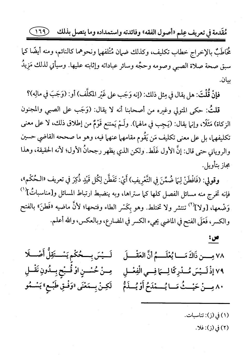 وقولي: (فَافْطَنْ لِمَا ضُمِّنَ فِي التَّعْرِيفِ) أَيْ: تَفَطَّن لِكُل قَيْدٍ ذُكِرَ في تعريف "الحُكْم"، فإنه تخرج منه مسائل الفصل كلها كما ستراها، وبه ينضبط ارتباط المسائل و [مناسباتُ] (¬1) وَضْعها، [ولا] (¬2) تنتشر ولا تختلط. وهو بِكَسْر الطاء وفتحها؛ لأنَّ ماضيه "فَطنَ" بالفتح والكسر، فَعَلَى الفتح في الماضي يجيء الكسر في المضارع، وبالعكس، والله أعلم.
