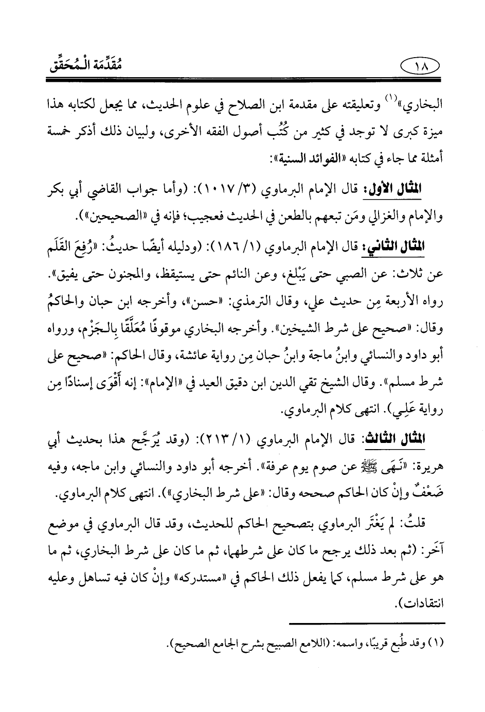 المثال الثاني: قال الإمام البرماوي (1/ 186): (ودليله أيضًا حديثُ: "رُفِعَ القَلَم عن ثلاث: عن الصبي حتى يَبْلغ، وعن النائم حتى يستيقظ، والمجنون حتى يفيق". رواه الأربعة مِن حديث علي، وقال الترمذي: "حسن"، وأخرجه ابن حبان والحاكمُ وقال: "صحيح على شرط الشيخين". وأخرجه البخاري موقوفًا مُعَلَّقًا بِالجَزْم، ورواه أبو داود والنسائي وابنُ ماجه وابنُ حبان مِن رواية عائشة، وقال الحاكم: "صحيح على شرط مسلم". وقال الشيخ تقي الدين ابن دقيق العيد في "الإمام": إنه أَقْوَى إسنادًا مِن رواية عَلِي). انتهى كلام البرماوي.
