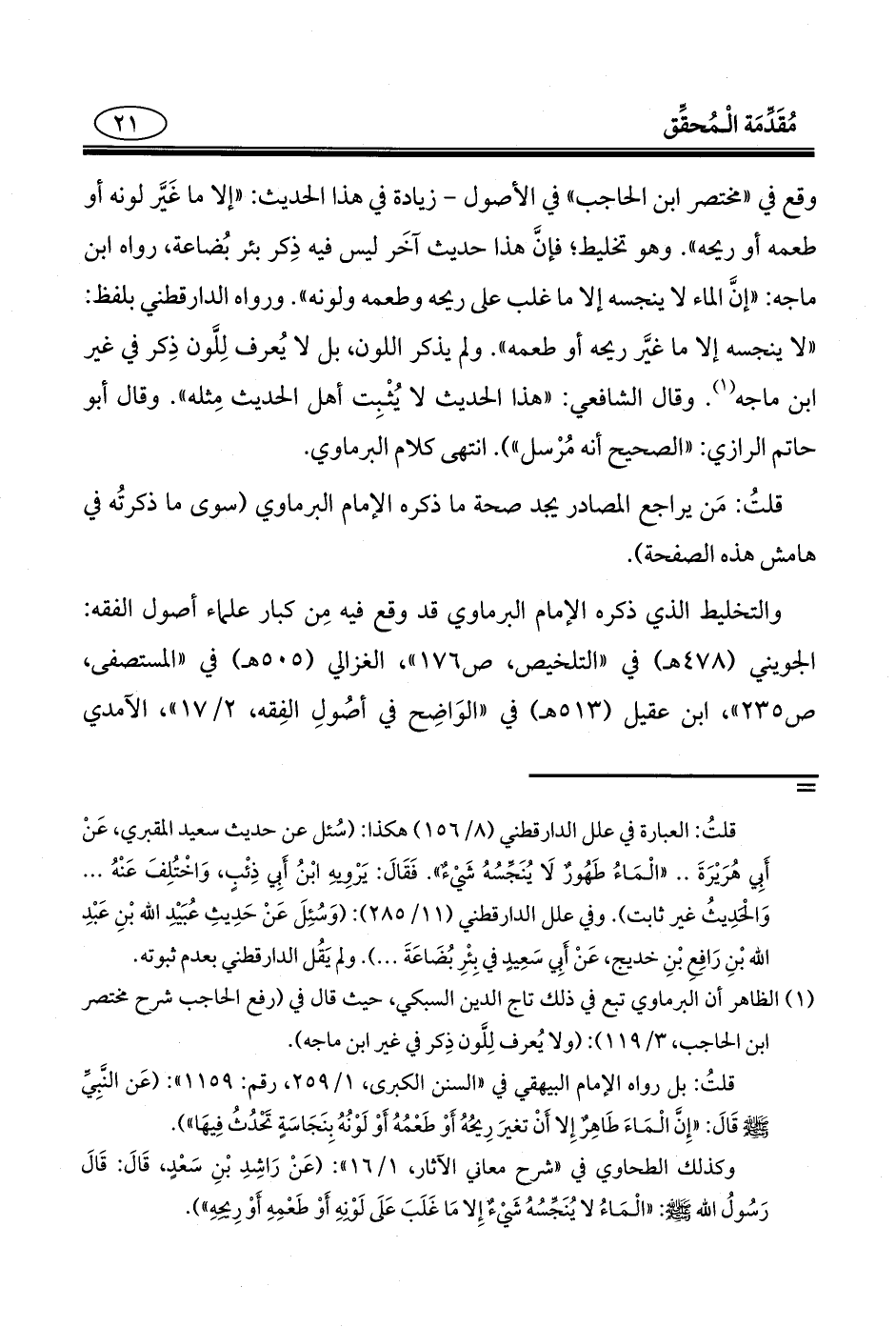 وقع في "مختصر ابن الحاجب" في الأصول - زيادة في هذا الحديث: "إلا ما غَيَّر لونه أو طعمه أو ريحه". وهو تخليط؛ فإنَّ هذا حديث آخَر ليس فيه ذِكر بئر بُضاعة، رواه ابن ماجه: "إنَّ الماء لا ينجسه إلا ما غلب على ريحه وطعمه ولونه". ورواه الدارقطني بلفظ: "لا ينجسه إلا ما غيَّر ريحه أو طعمه". ولم يذكر اللون، بل لا يُعرف لِلَّون ذِكر في غير ابن ماجه (¬1). وقال الشافعي: "هذا الحديث لا يُثْبِت أهل الحديث مِثله". وقال أبو حاتم الرازي: "الصحيح أنه مُرْسل"). انتهى كلام البرماوي.