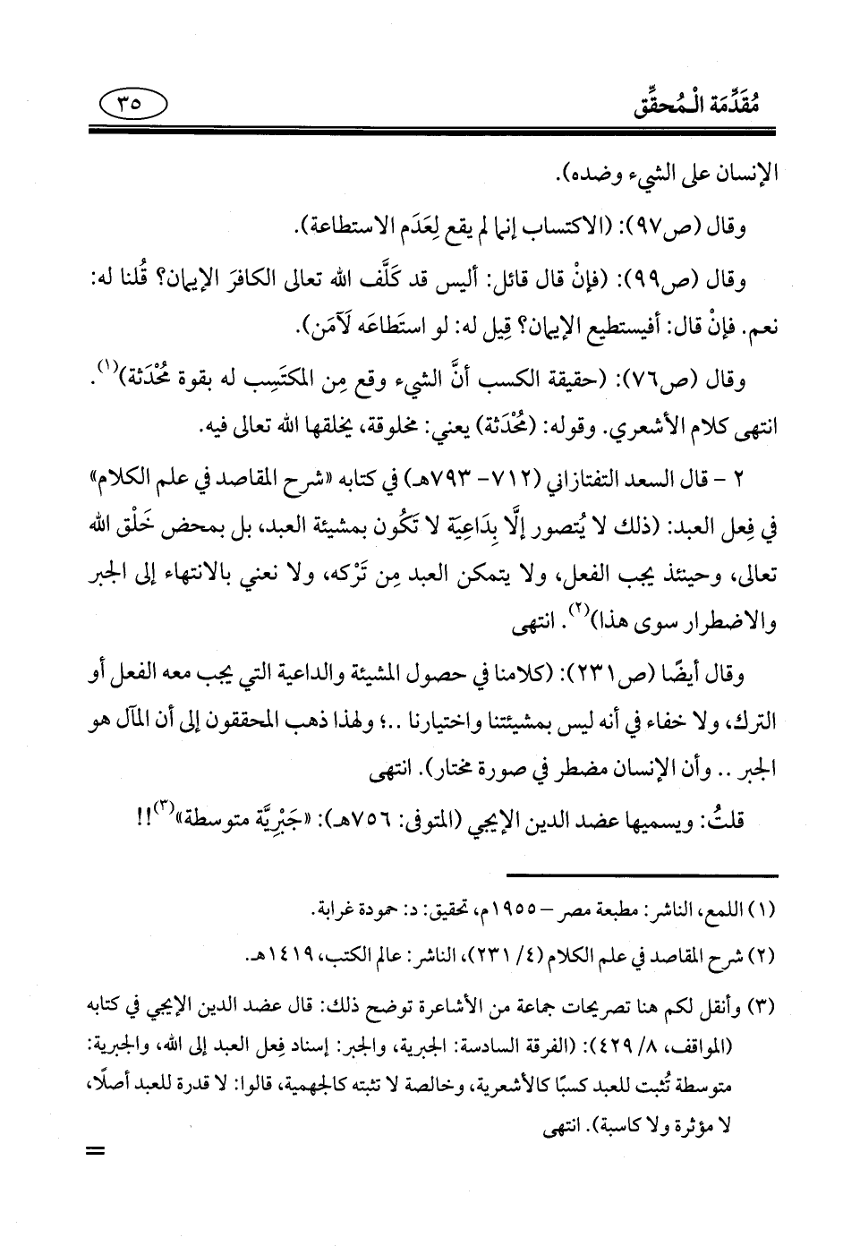 2 - قال السعد التفتازاني (712 - 793 هـ) في كتابه "شرح المقاصد في علم الكلام" في فِعل العبد: (ذلك لا يُتصور إلَّا بِدَاعِيَة لا تَكُون بمشيئة العبد، بل بمحض خَلْق الله تعالى، وحينئذ يجب الفعل، ولا يتمكن العبد مِن تَرْكه، ولا نعني بالانتهاء إلى الجبر والاضطرار سوى هذا) (¬2). انتهى