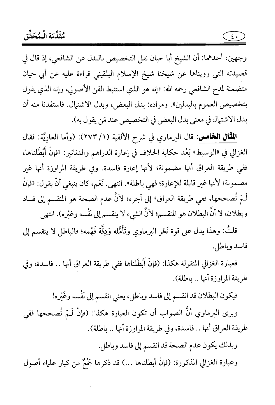 المثال الخامس: قال البرماوي في شرح الألفية (1/ 273): (وأما العارِيَّة: فقال الغزالي في "الوسيط" بَعْد حكاية الخلاف في إعارة الدراهم والدنانير: "فإنْ أَبْطَلناها، ففي طريقة العراق أنها مضمونة؛ لأنها إعارة فاسدة. وفي طريقة المراوزة أنها غير مضمونة؛ لأنها غير قابلة للإعارة؛ فهي باطلة". انتهى. نَعَم، كان ينبغي أنْ يقول: "فإنْ لَمْ نُصححها، ففي طريقة العراق" إلى آخِره؛ لأنَّ عدم الصحة هو المنقسم إلى فساد وبطلان، لا أنَّ البطلان هو المنقسم؛ لأنَّ الشيء لا ينقسم إلى نَفْسه وغيْره). انتهى
