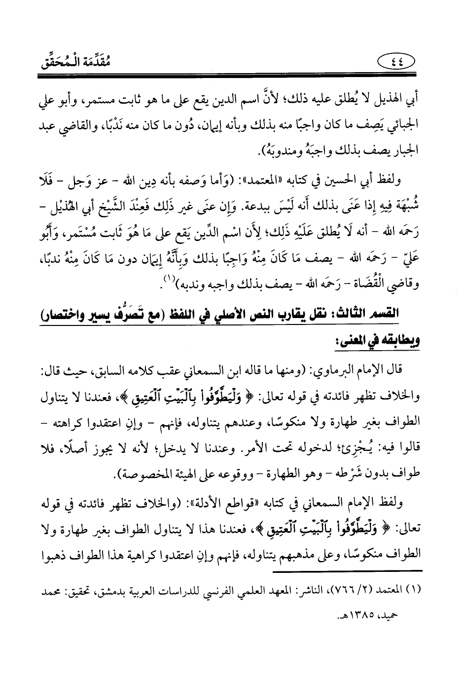 ولفظ أبي الحسين في كتابه "المعتمد": (وَأما وَصفه بأنه دِين الله - عز وَجل - فَلَا شُبْهَة فِيهِ إِذا عَنَى بذلك أَنه لَيْسَ ببدعة. وَإِن عنَى غير ذَلِك فَعِنْدَ الشَّيْخ أبي الهُذيْل - رَحمَه الله - أنه لَا يُطلق عَلَيْهِ ذَلِك؛ لِأَن اسْم الدِّين يَقع على مَا هُوَ ثَابت مُسْتَمر، وَأَبُو عَليّ - رَحمَه الله - يصف مَا كَانَ مِنْهُ وَاجِبًا بذلك وَبِأَنَّهُ إِيمَان دون مَا كَانَ مِنْهُ ندبًا، وقاضي الْقُضَاة - رَحمَه الله - يصف بذلك واجبه وندبه) (¬1).