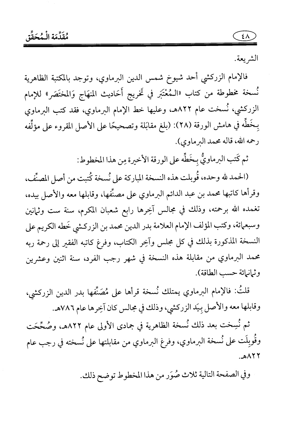 قلتُ: فالإمام البرماوي يمتلك نُسخة قرأها على مُصَنَّفها بدر الدين الزركشي، وقابلها معه والأصل بِيَد الزركشي، وذلك في مجالس كان آخِرها عام 786 هـ.